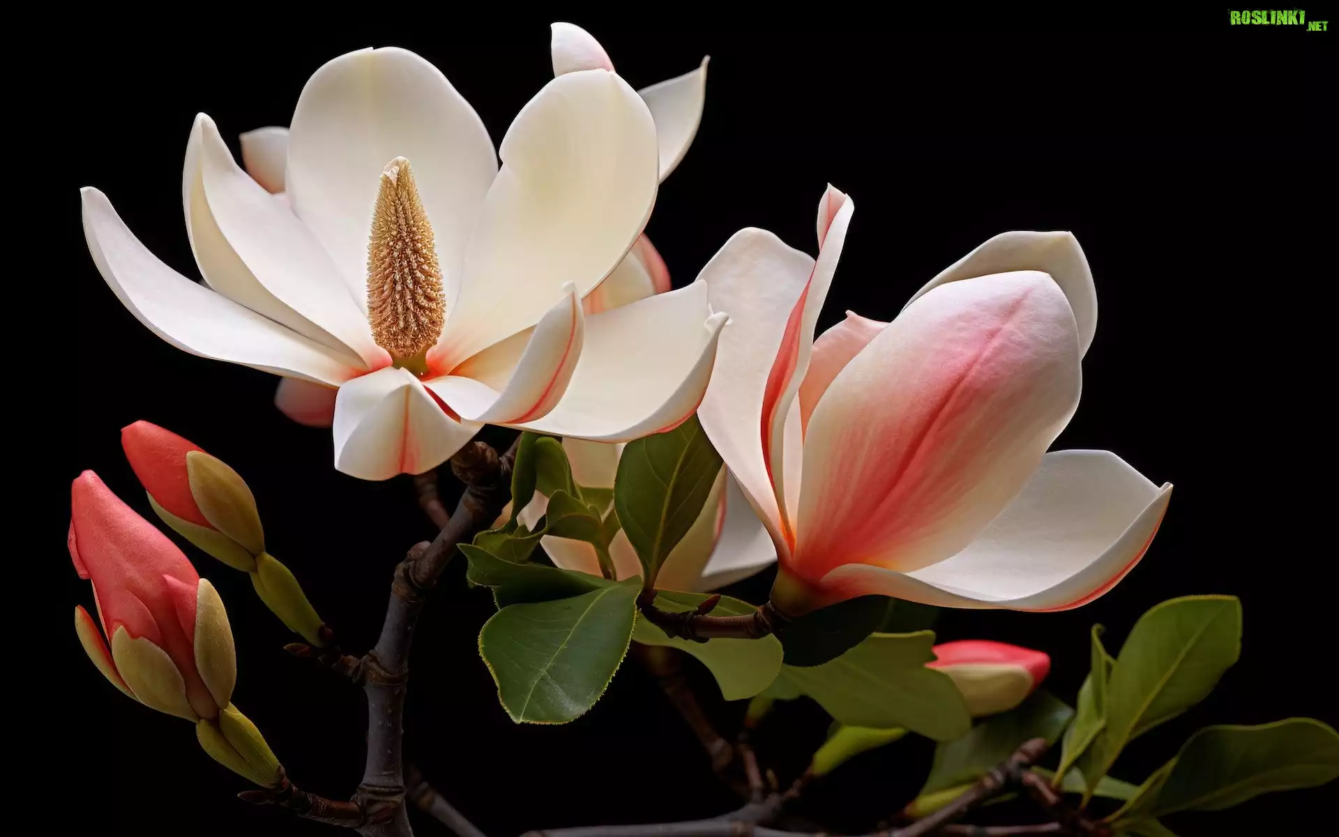 Rośliny: Biało-różowe, Kwiaty, Magnolia, Liście, Ciemne, Tło, Grafika