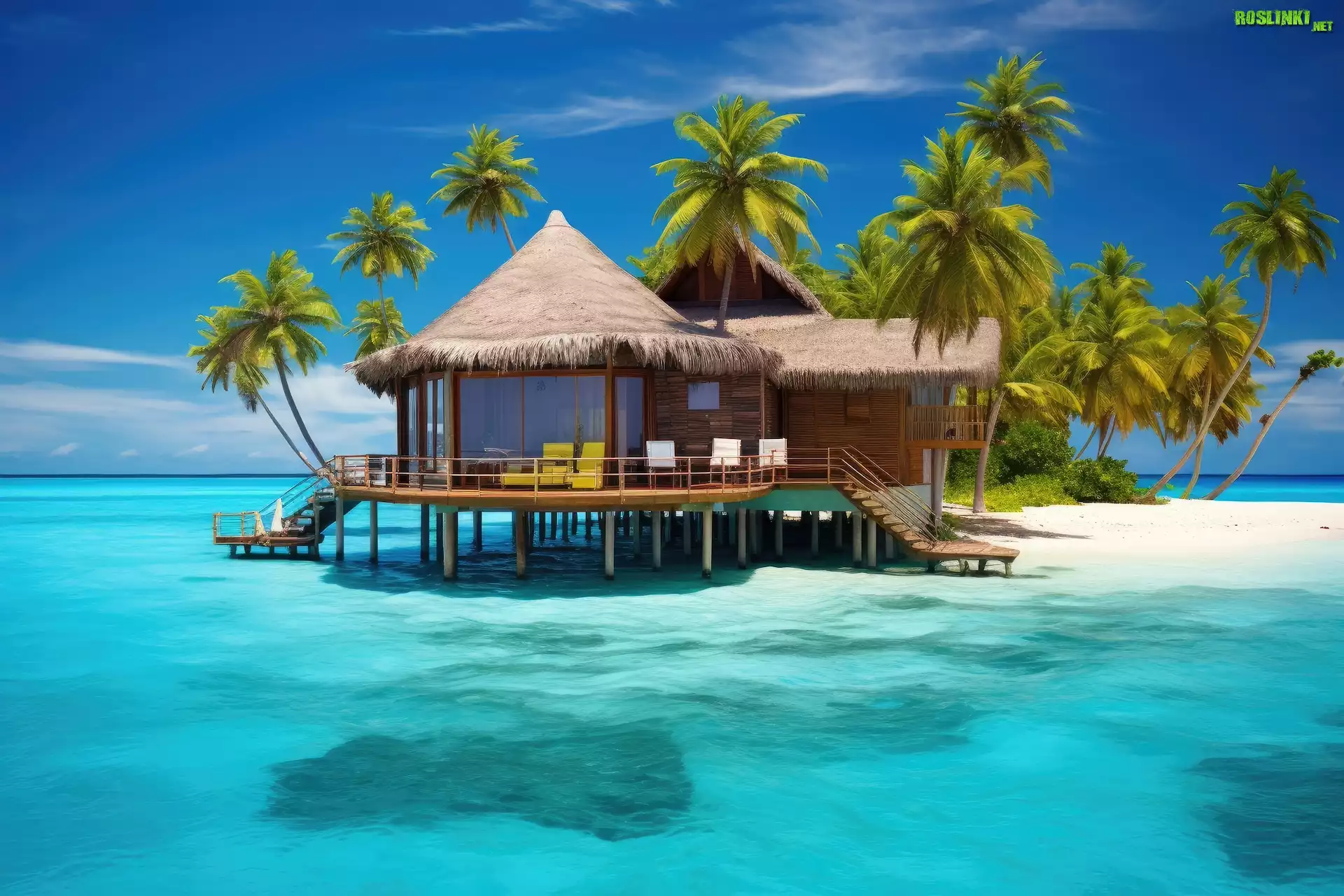 Rośliny: Morze, Domek, Palmy, Grafika