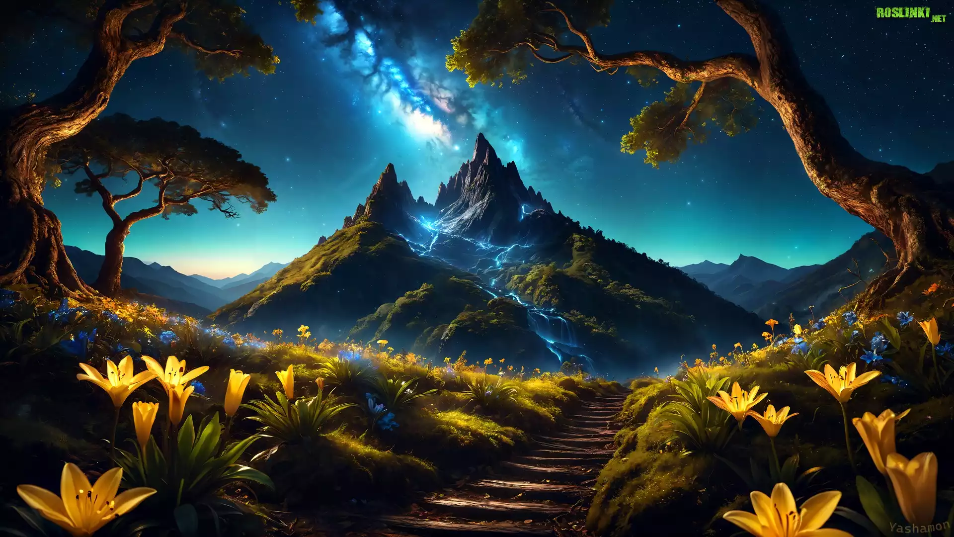 Rośliny: Kwiaty, Drzewa, Schody, Góry, Droga Mleczna, Noc, Grafika