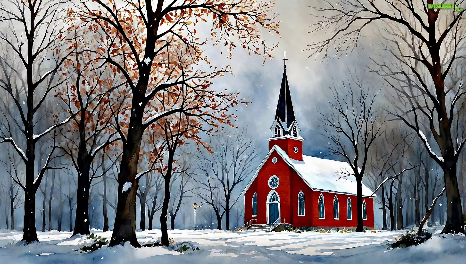 Rośliny: Zima, Kościół, Drzewa, Grafika