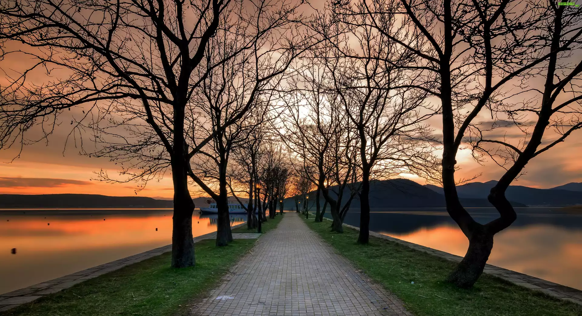 Rośliny: Drzewa, Droga, Latarnie, Jezioro Kastoria, Statek, Zachód słońca, Kastoria, Grecja