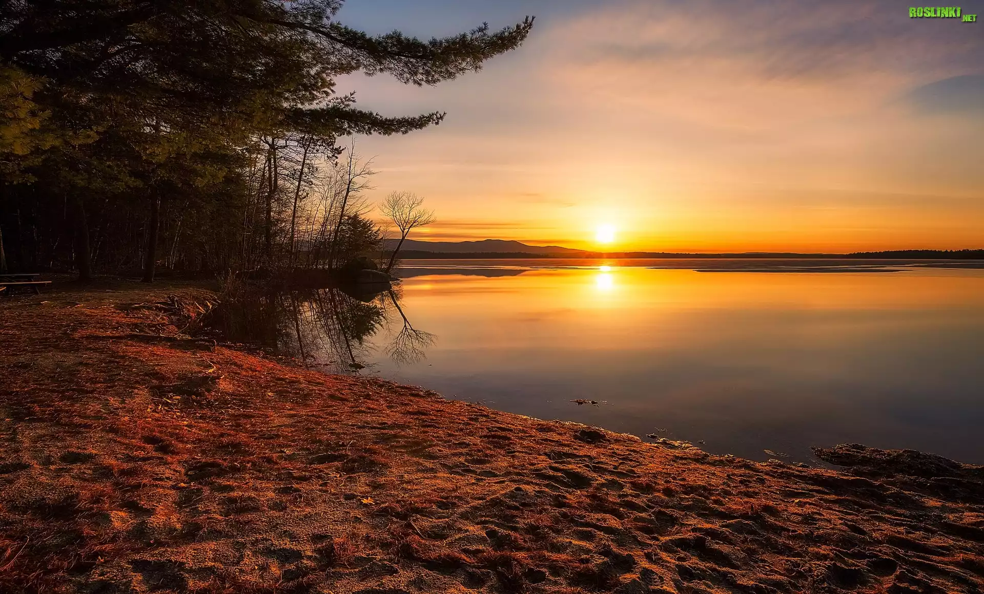 Stany Zjednoczone, Stan New Hampshire, Jezioro Lake Winnipesaukee, Plaża Leavitt Beach, Wschód słońca, Drzewa |