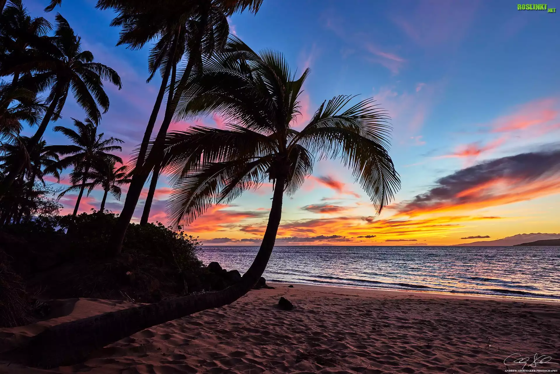 Hawaje, Maui, Morze, Zachód słońca, Palmy