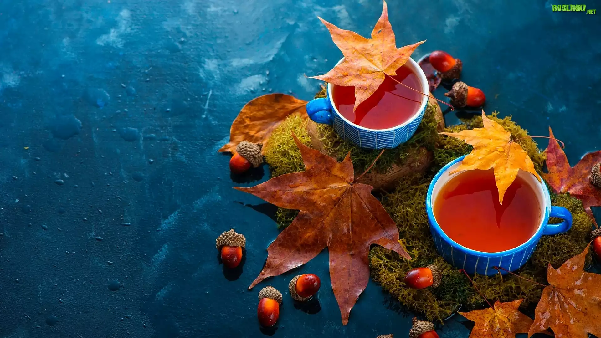Rośliny: Herbata, Niebieskie, Filiżanki, Liście, Żołędzie, Mech