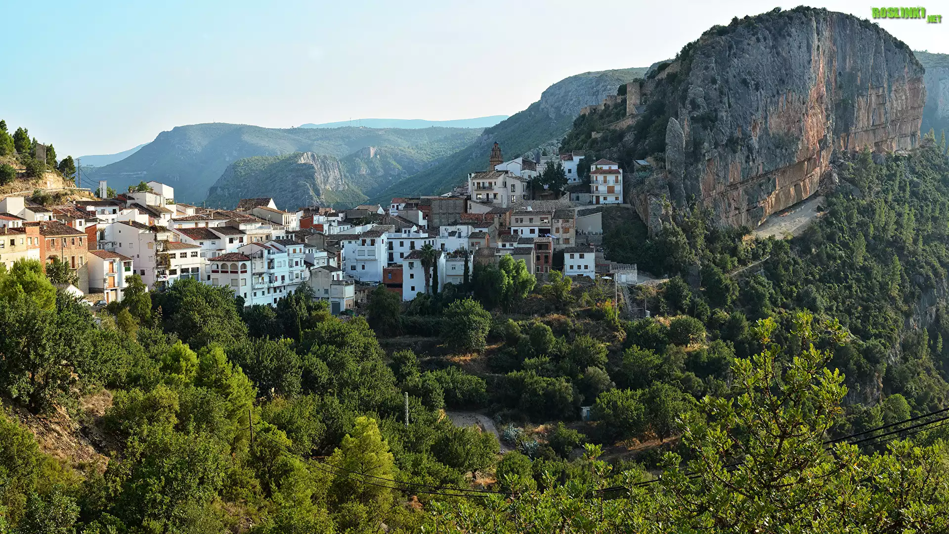 Rośliny: Domy, Drzewa, Góry, Skała, Miejscowość Chulilla, Prowincja Walencja, Hiszpania