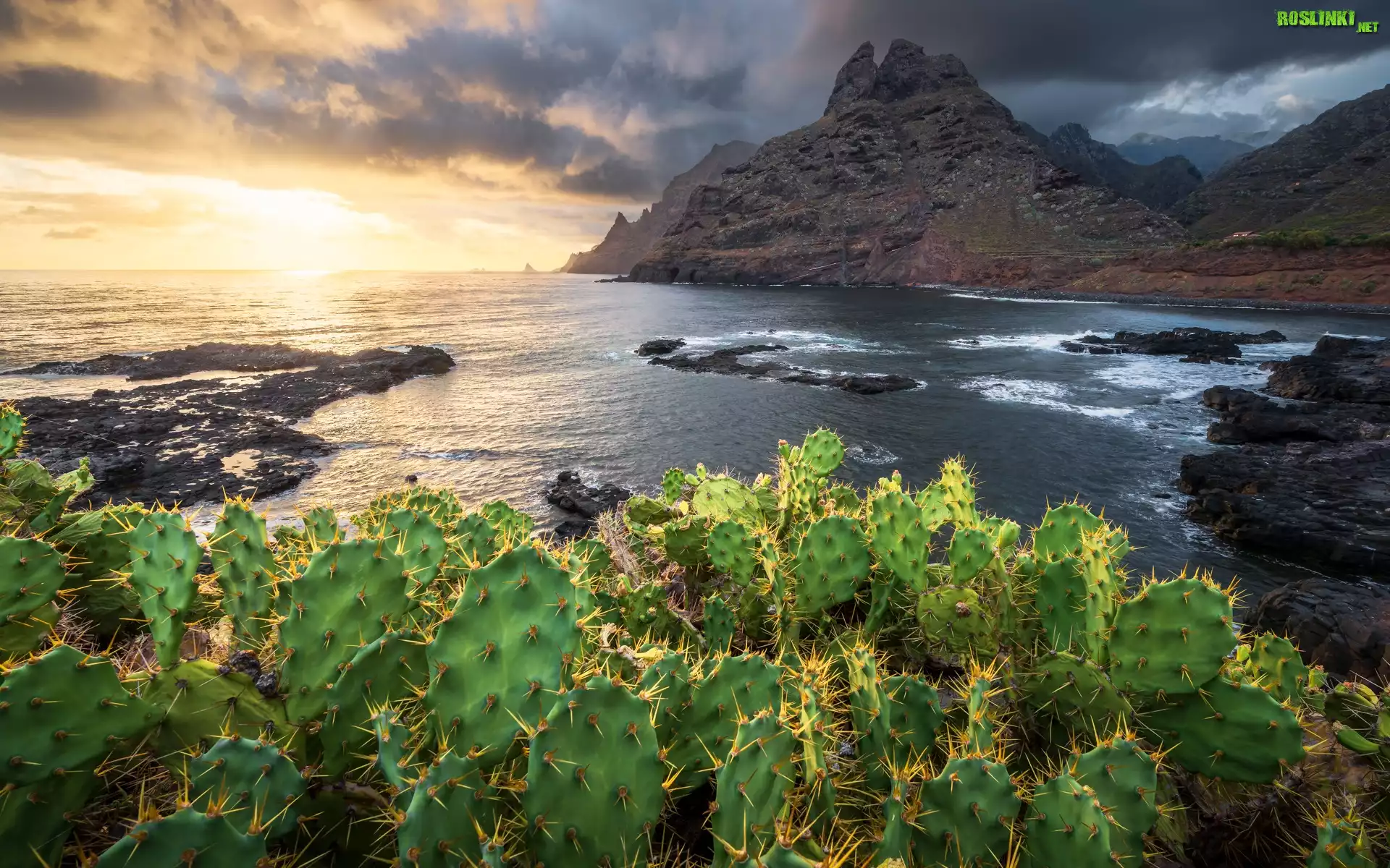 Rośliny: Hiszpania, Teneryfa, Morze, Wybrzeże, Góry, Kaktusy, Wschód słońca, Chmury
