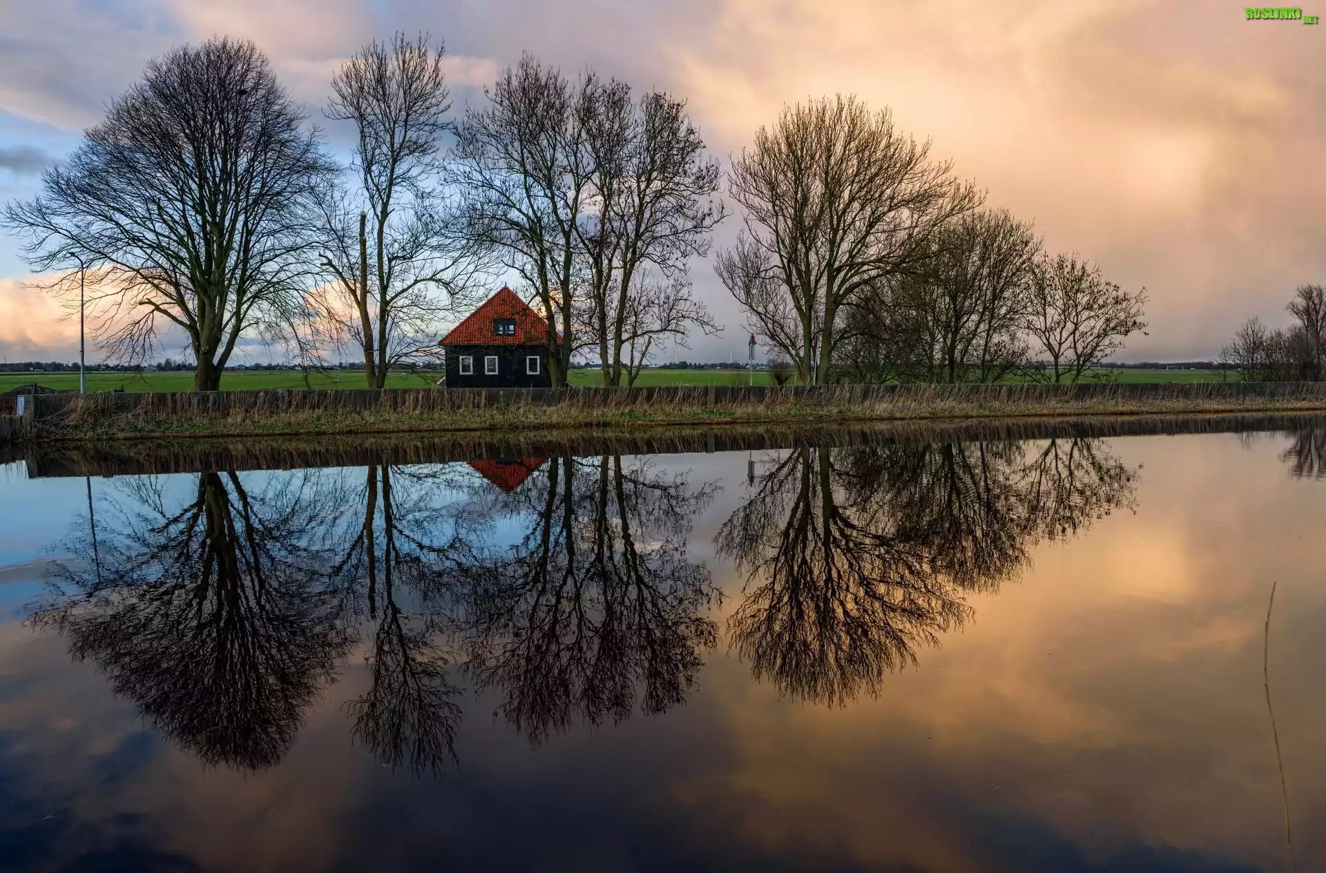 Rośliny: Holandia, Dom, Rzeka, Bezlistne, Drzewa, Odbicie