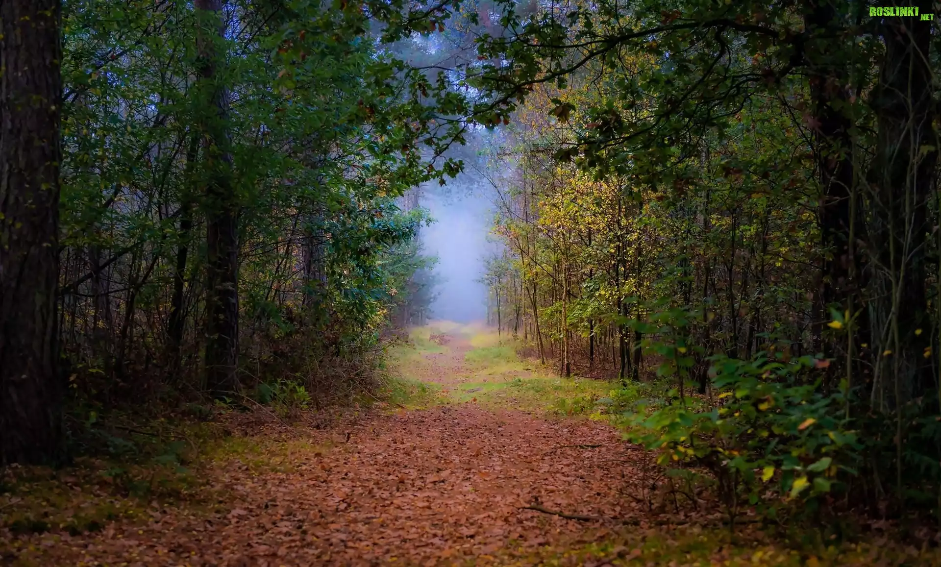 Holandia, Prowincja Brabancja Północna, Rezerwat przyrody Oisterwijkse Bossen en Vennen, Las, Ścieżka, Liście, Mgła, Jesień |