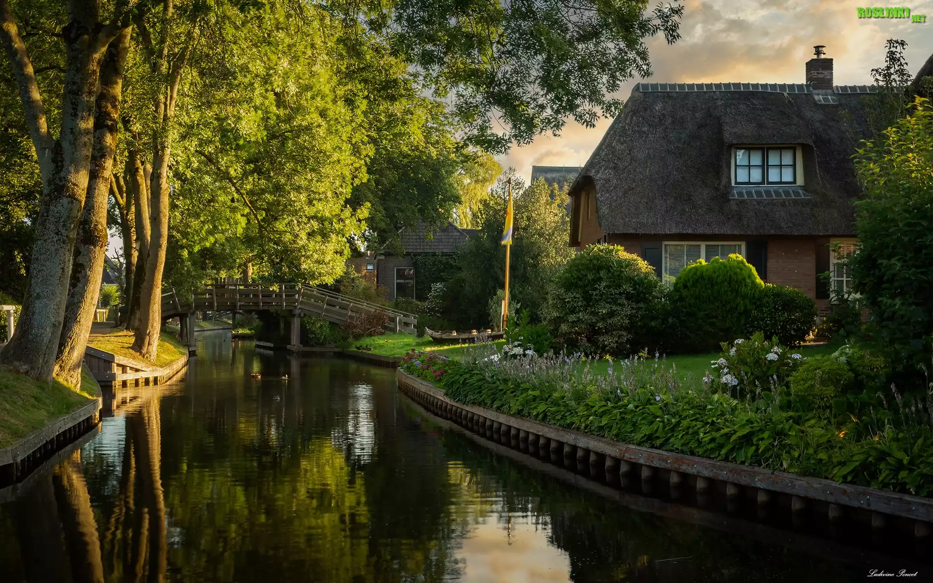 Rośliny: Rzeka, Dom, Most, Drzewa, Giethoorn, Prowincja Overijssel, Holandia