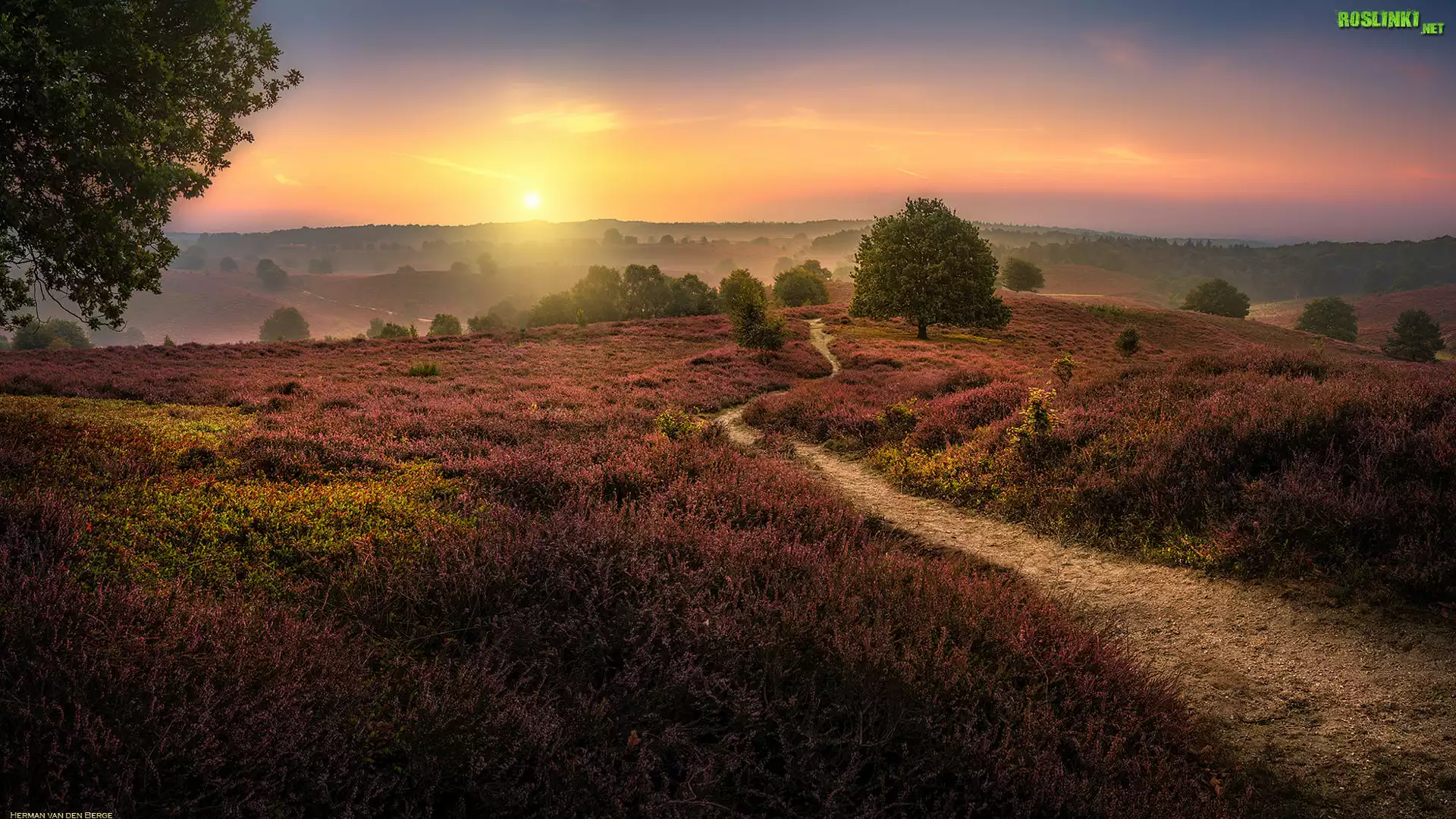 Holandia, Prowincja Geldria, Park Narodowy Veluwezoom, Wrzosowisko, Drzewa, Wrzos, Ścieżka, Wschód słońca, Mgła |