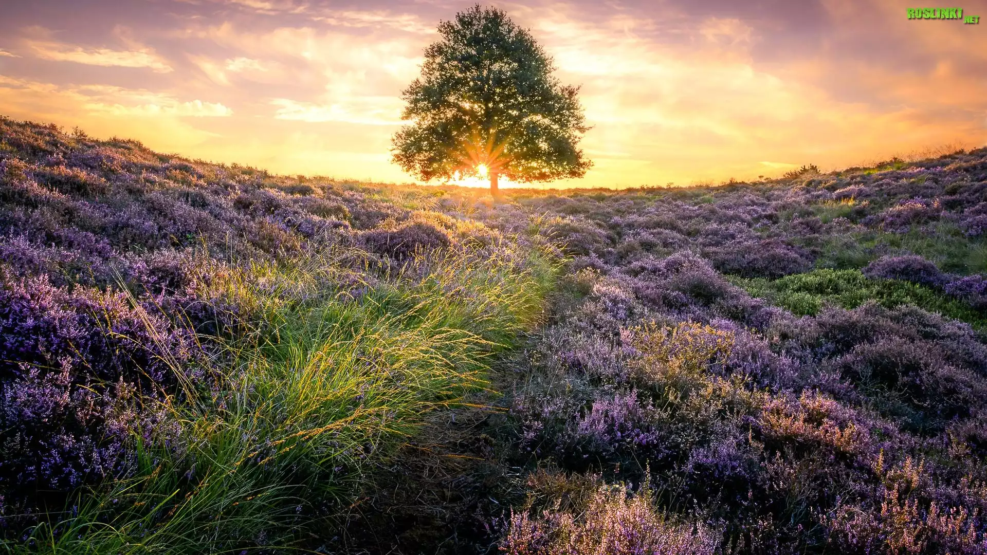 Rośliny: Holandia, Wzgórze, Posbank, Park Narodowy Veluwezoom, Wrzosowisko, Drzewo, Promienie słońca