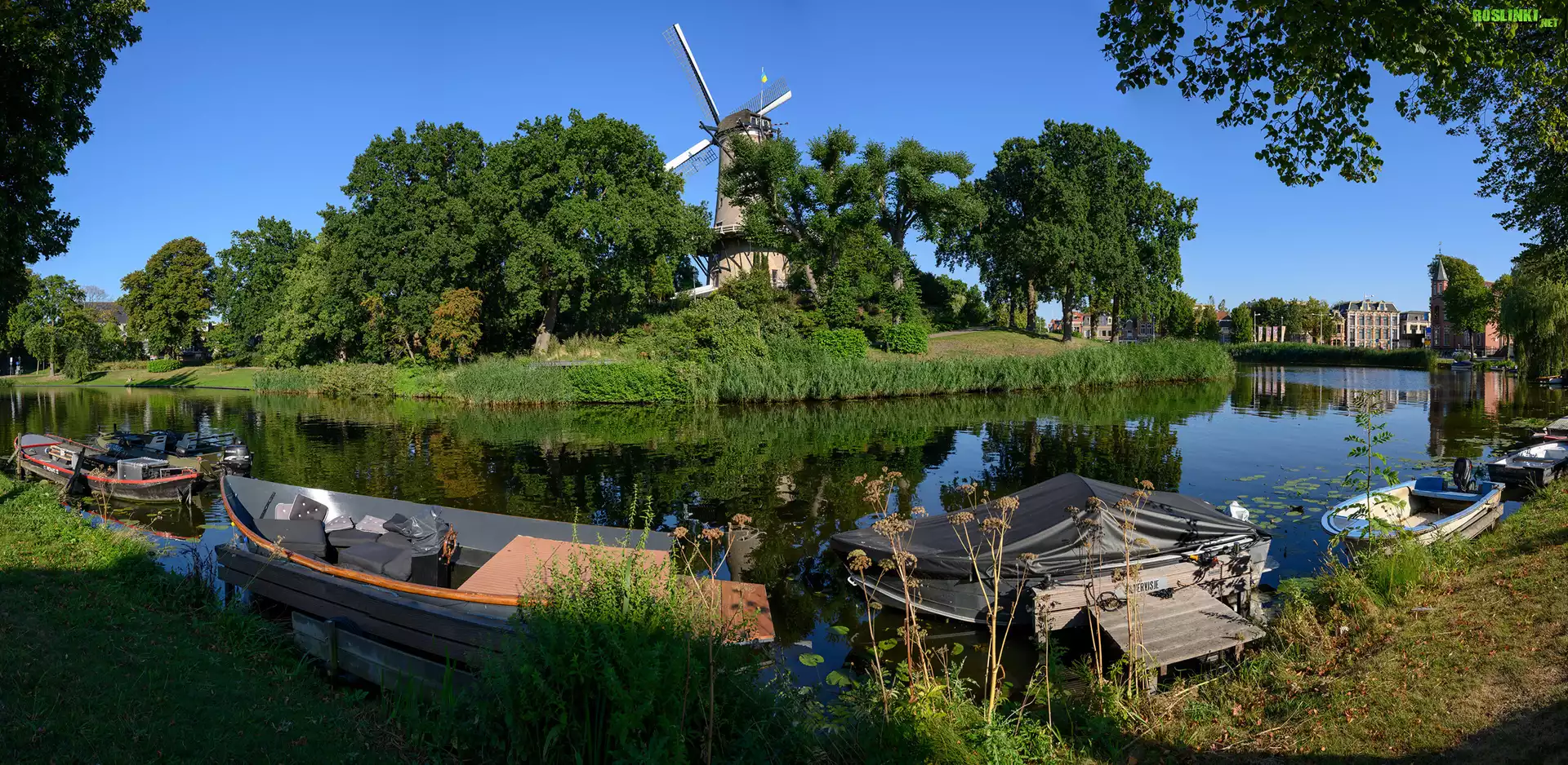Rośliny: Holandia, Alkmaar, Kanał wodny, Rzeka, Łódki, Wiatrak, Drzewa, Domy