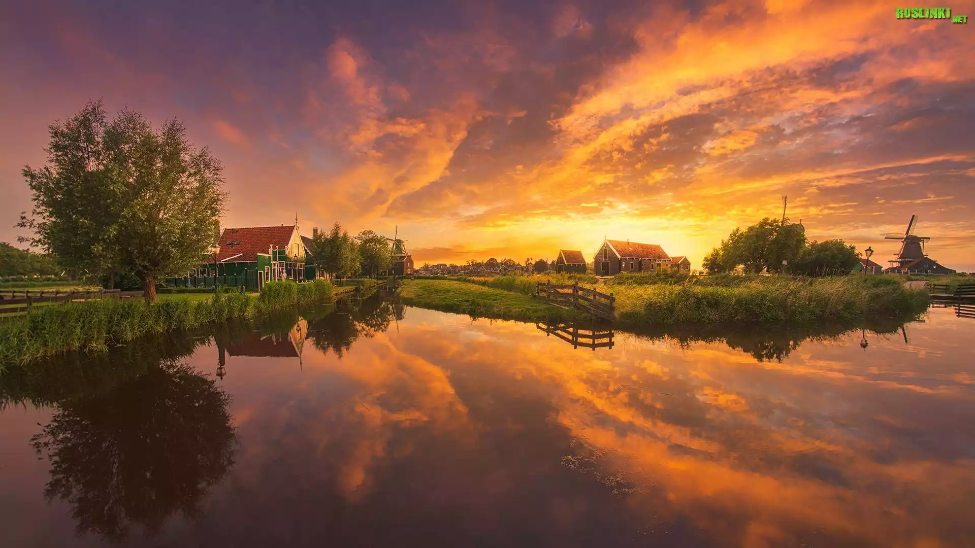 Holandia, Zaandam, Skansen Zaanse Schans, Skansen Wiatraków, Most, Wiatraki, Domy, Rzeka Zaan, Drzewa, Wschód słońca |