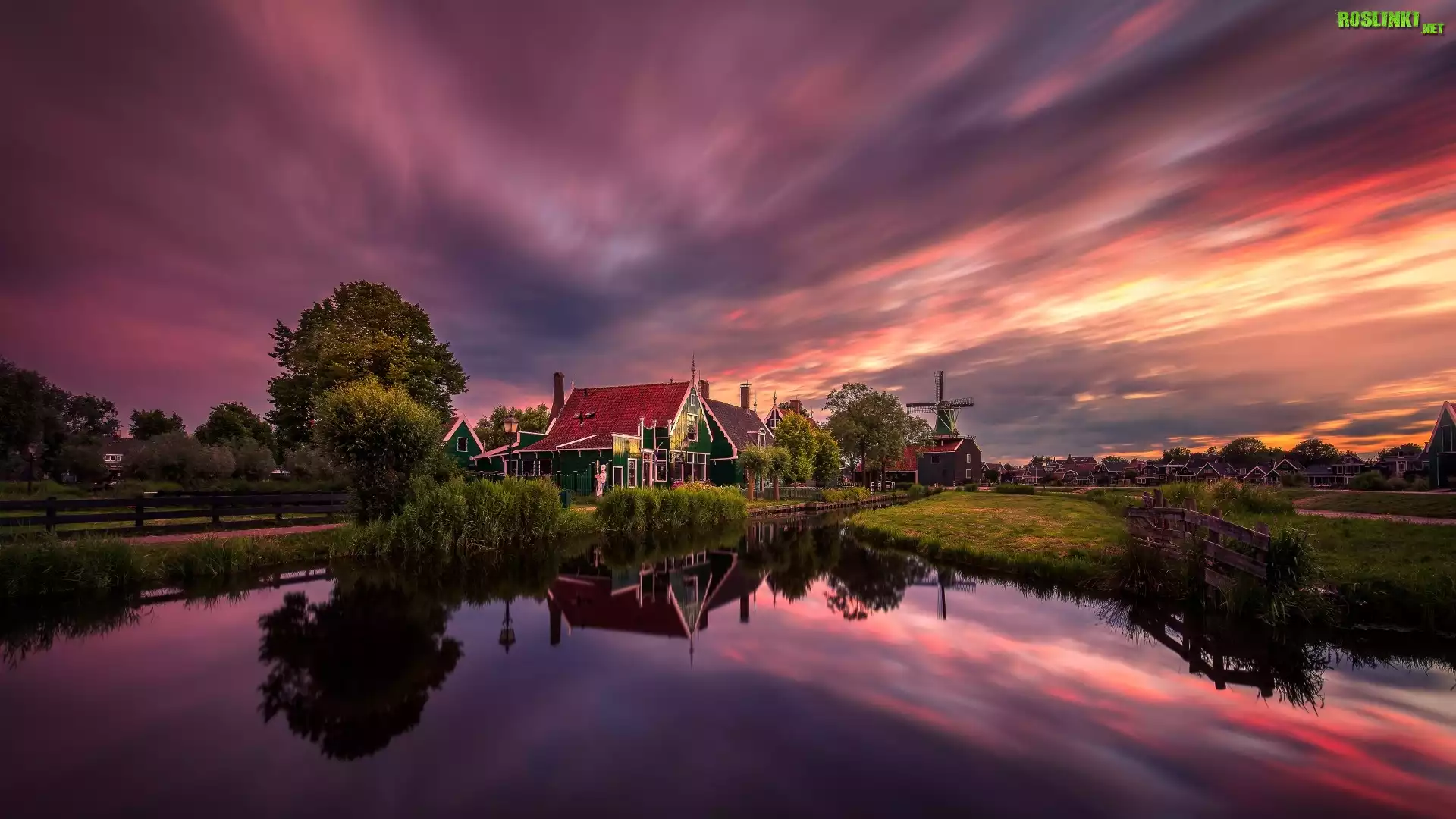 Holandia, Wiatrak, Domy, Rzeka, Drzewa, Zachód słońca, Skansen Zaanse Schans