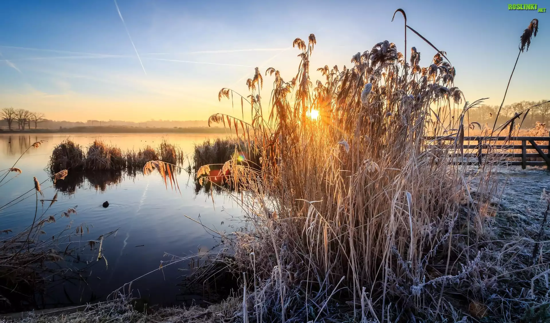 Holandia, Prowincja Overijssel, Gmina Enschede, Rezerwat przyrody Kristalbad, Zbiornik wodny, Jezioro, Trawy, Szron, Zachód słońca |