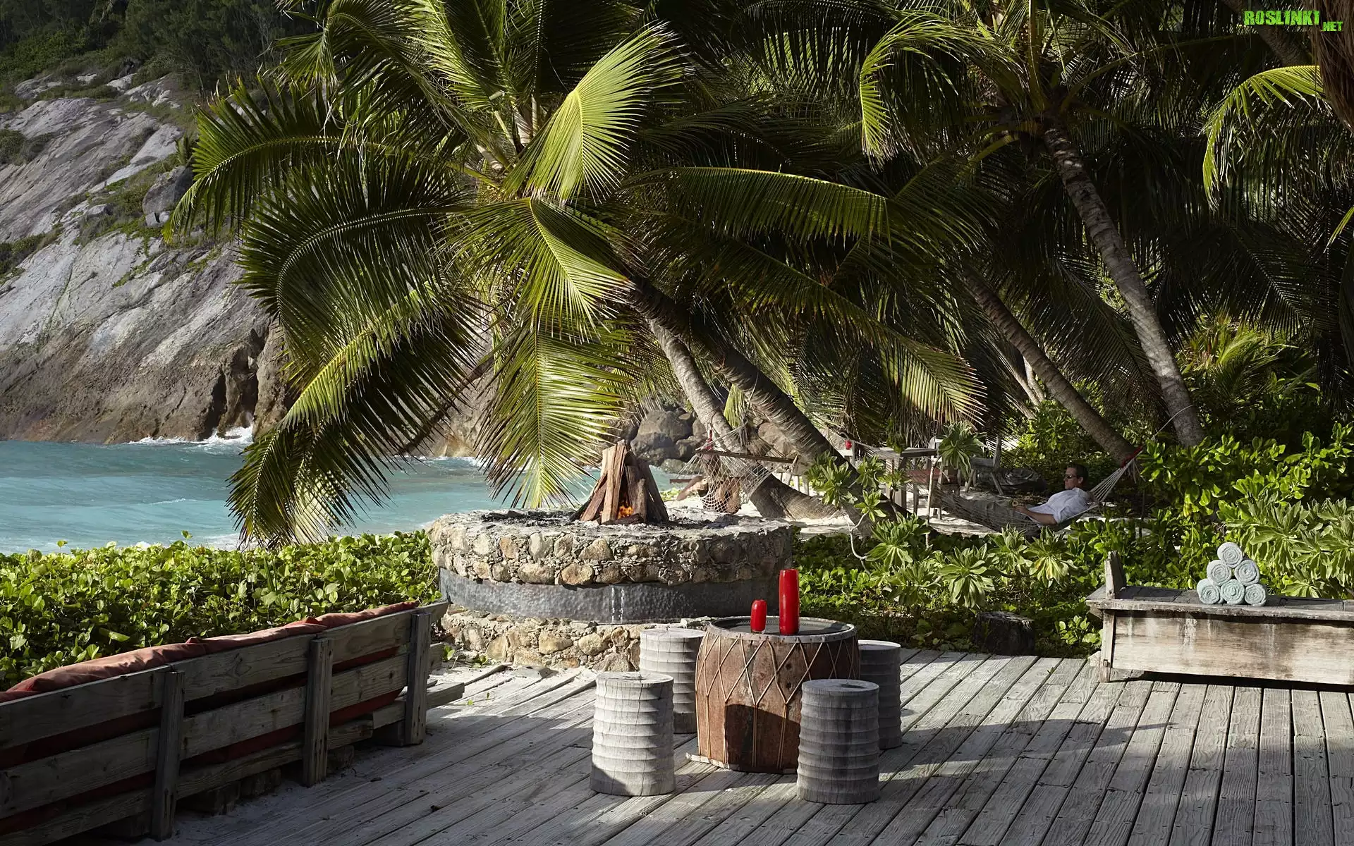Rośliny: Hotel, Taras, Palmy, Ocean, Skały, Seszele