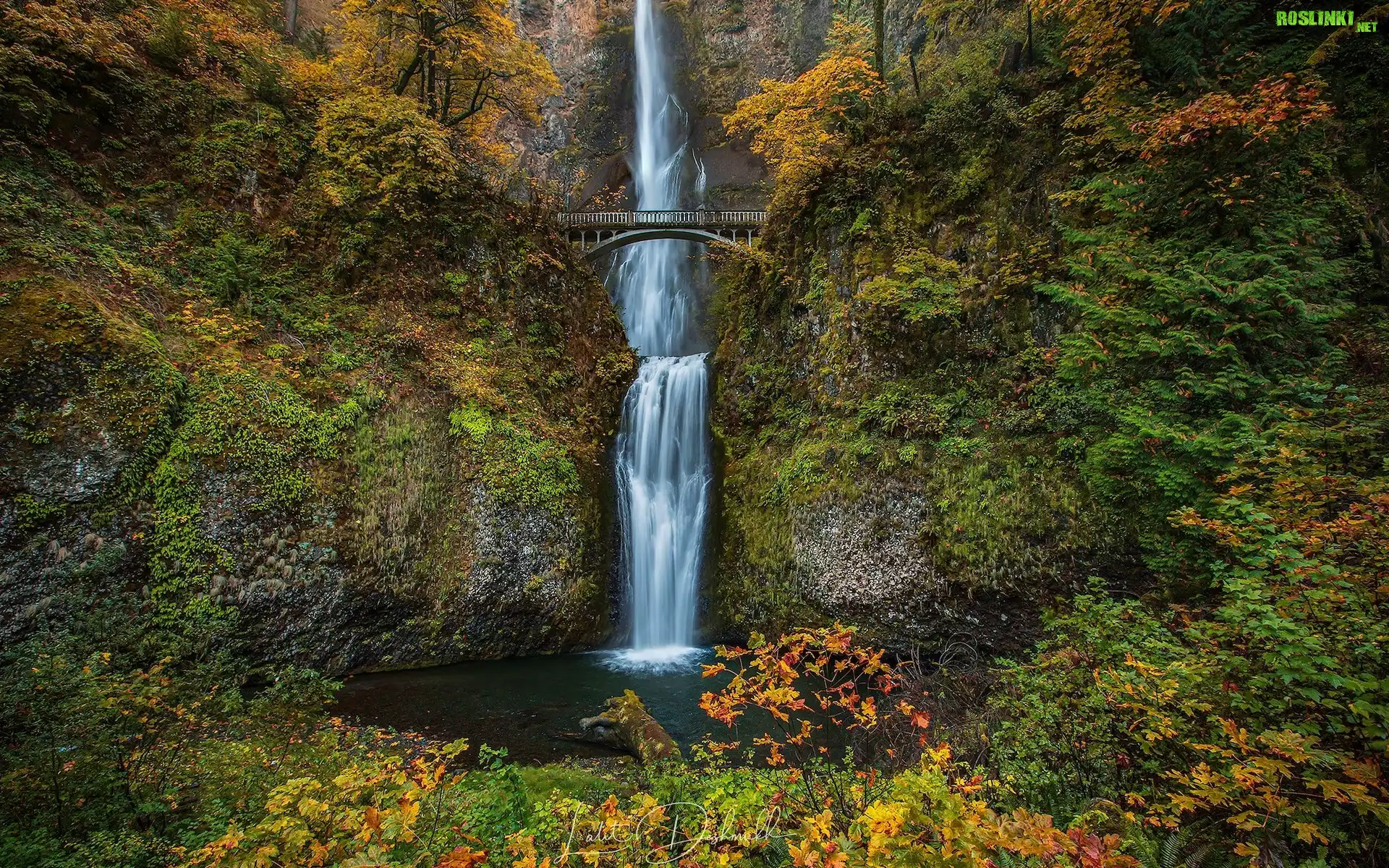Rośliny: Wodospad, Multnomah Falls, Most, Skały, Drzewa, Hrabstwo Multnomah, Oregon, Stany Zjednoczone