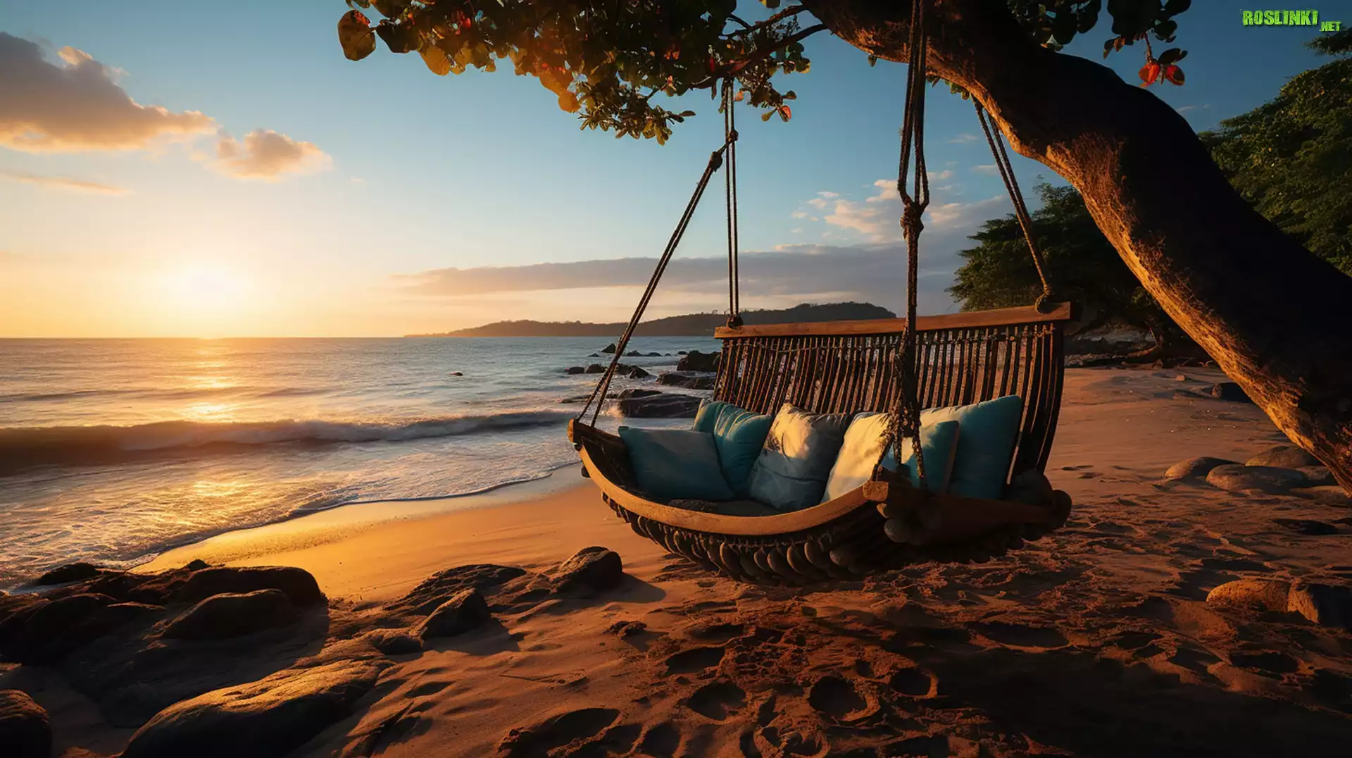 Rośliny: Morze, Plaża, Drzewo, Huśtawka, Zachód słońca