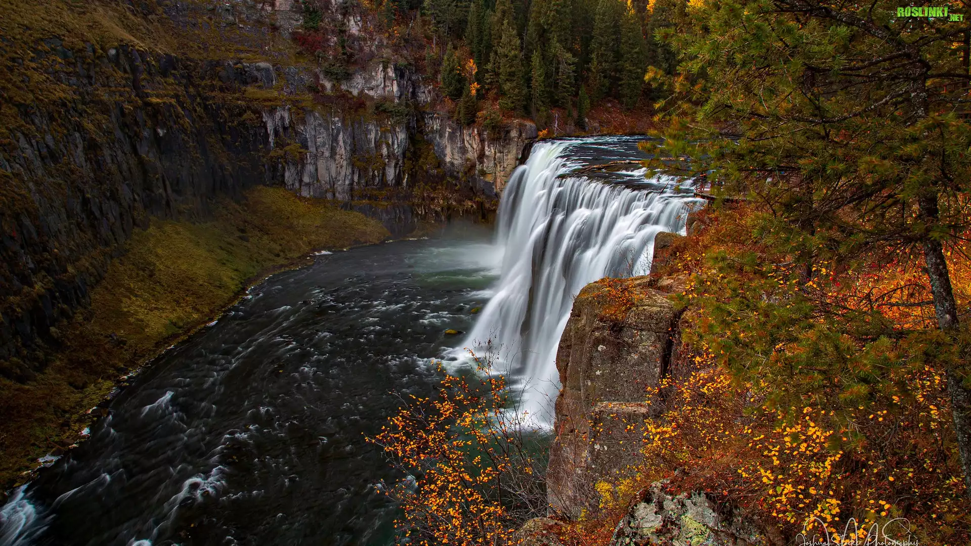 Rośliny: Jesień, Wodospad, Upper Mesa Falls, Las, Drzewa, Skały, Rzeka, Idaho, Stany Zjednoczone