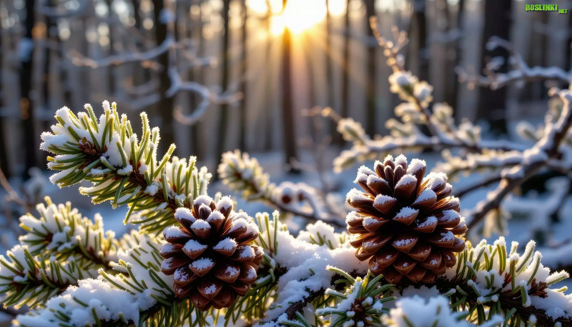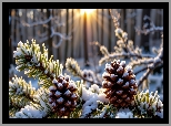 Rośliny: Szyszki, Gałązki, Las, Słońce, Zima, Grafika AI, Iglak