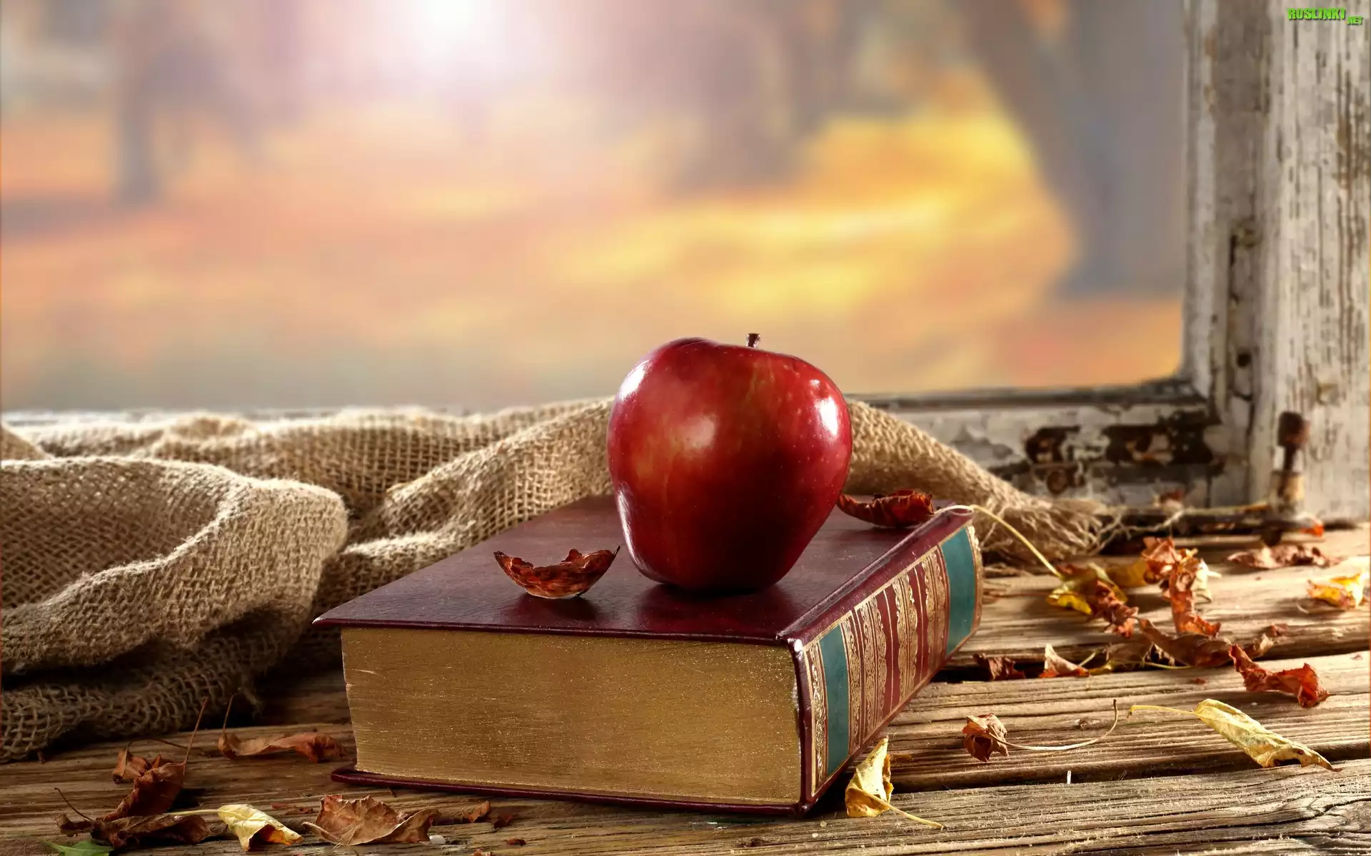 Rośliny: Jabłko, Książka, Jesienne, Liście, Okno, Kompozycja