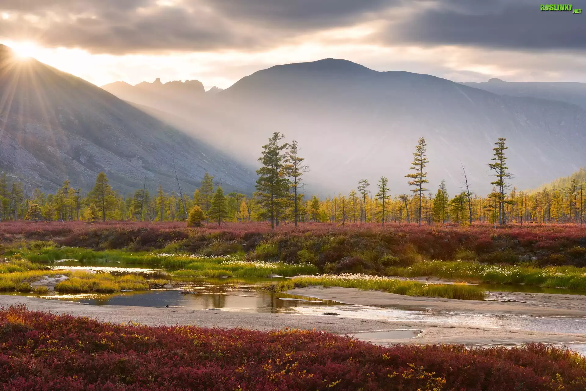Góry Kołymskie, Brzeg, Jezioro Jack London, Drzewa, Krzewy, Promienie słońca, Kołyma, Obwód magadański, Rosja |