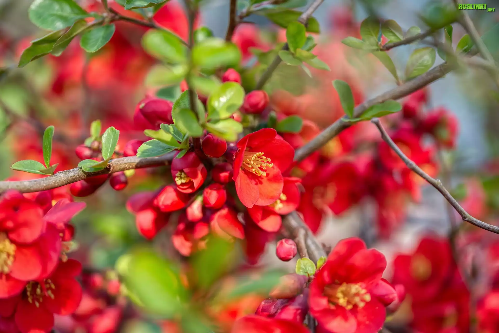 Rośliny: Czerwone, Kwiaty, Pigwowiec japoński, Gałązki, Liście