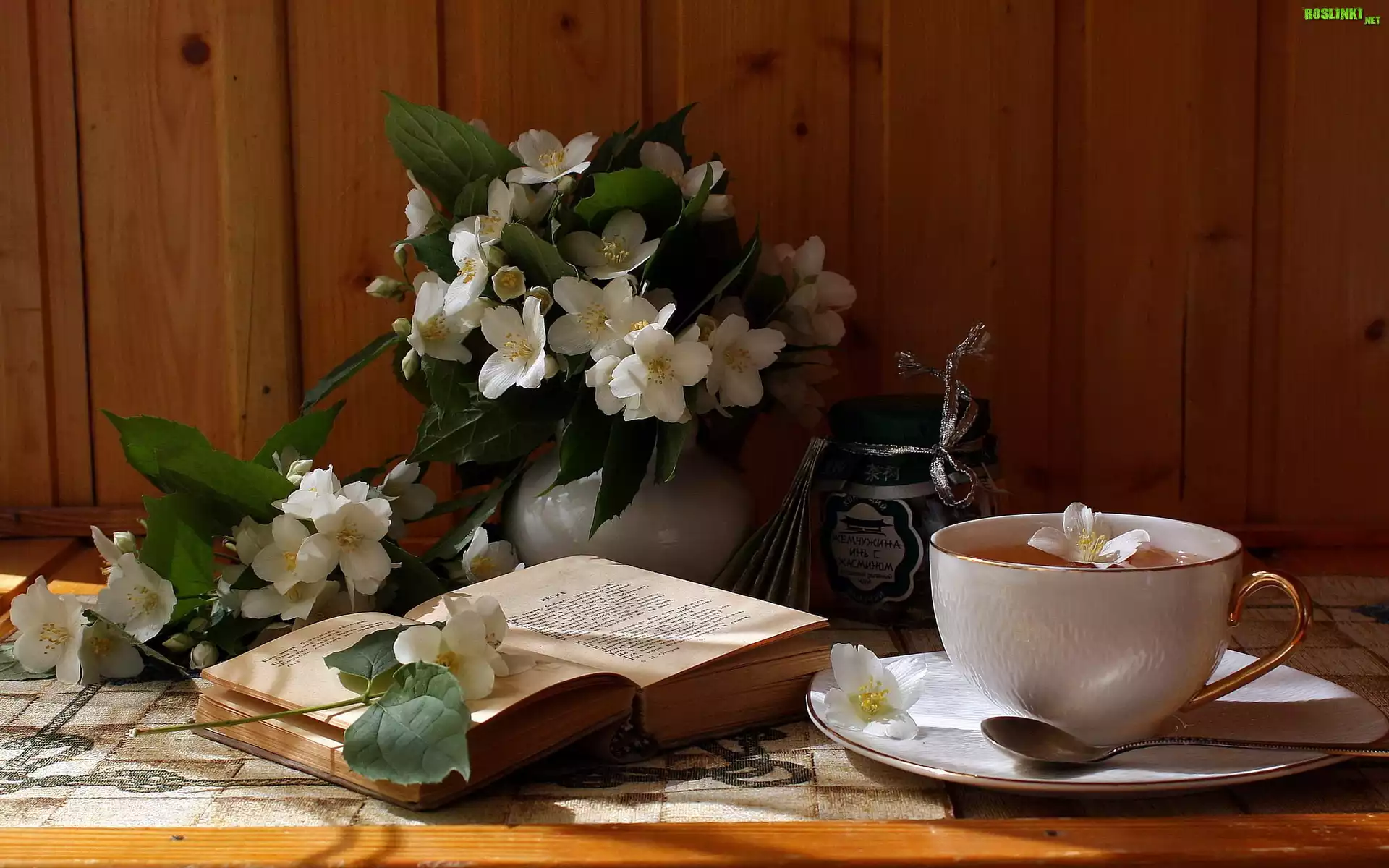 Jaśmin, Bukiet, Filiżanka, Herbaty, Kompozycja