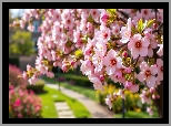 Drzewo owocowe, Gałązki, Jasnoróżowe, Kwiaty, Listki, Alejka