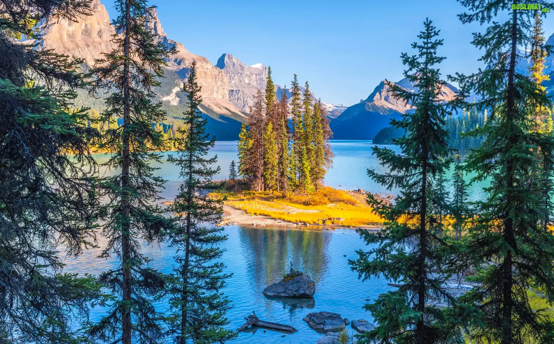 Rośliny: Kanada, Park Narodowy Jasper, Góry, Jezioro Maligne Lake, Wyspa Spirit Island, Drzewa, Alberta