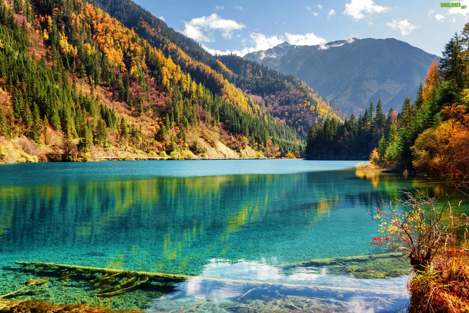 Rośliny:  Chiny, Park Narodowy Jiuzhaigou, Jesień, Las, Góry, Jezioro Arrow Bamboo, Drzewa