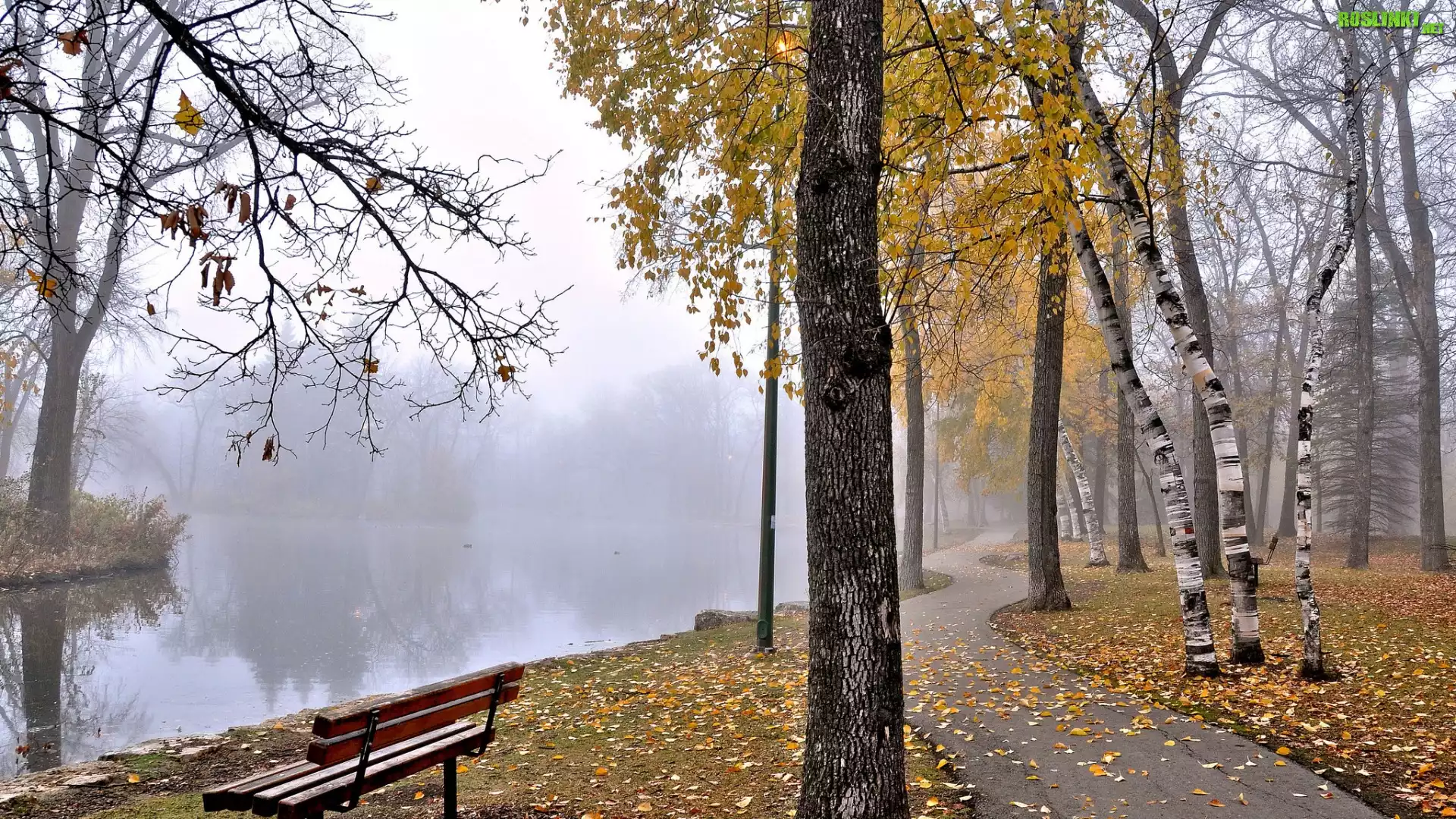 Rośliny: Jesień, Park, Drzewa, Mgła, Ławka, Staw