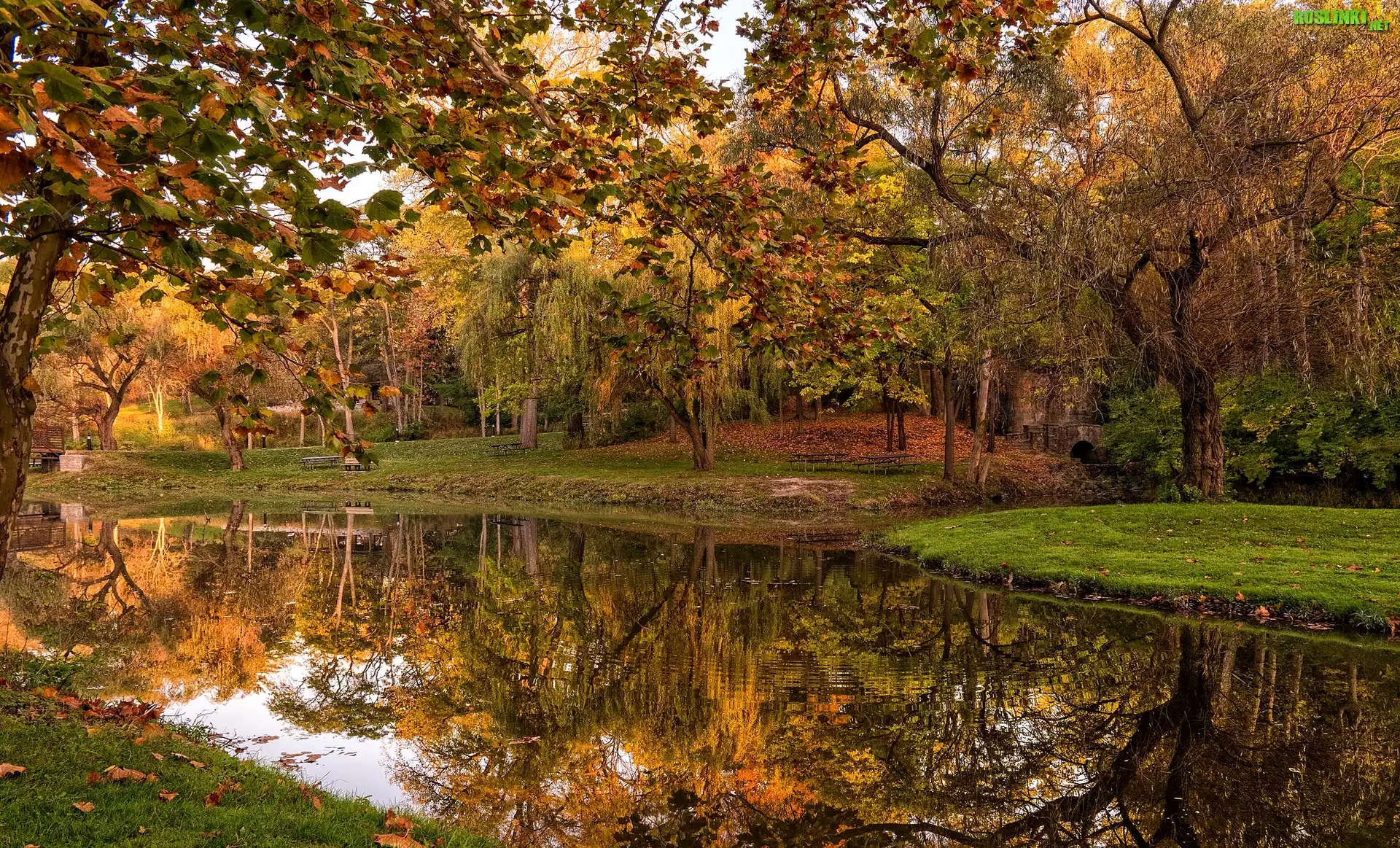 Rośliny: Jesień, Park, Drzewa, Staw, Ławki, Most