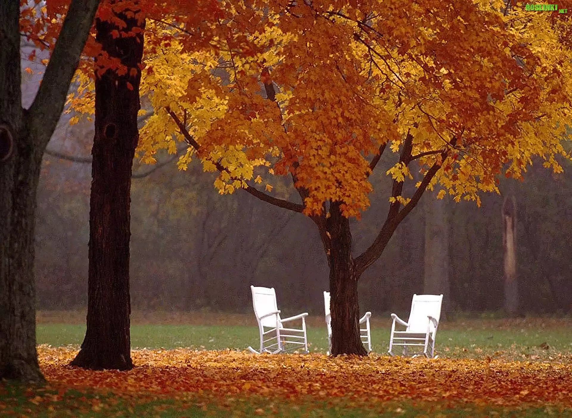Rośliny: Jesień, Drzewa, Białe, Krzesła