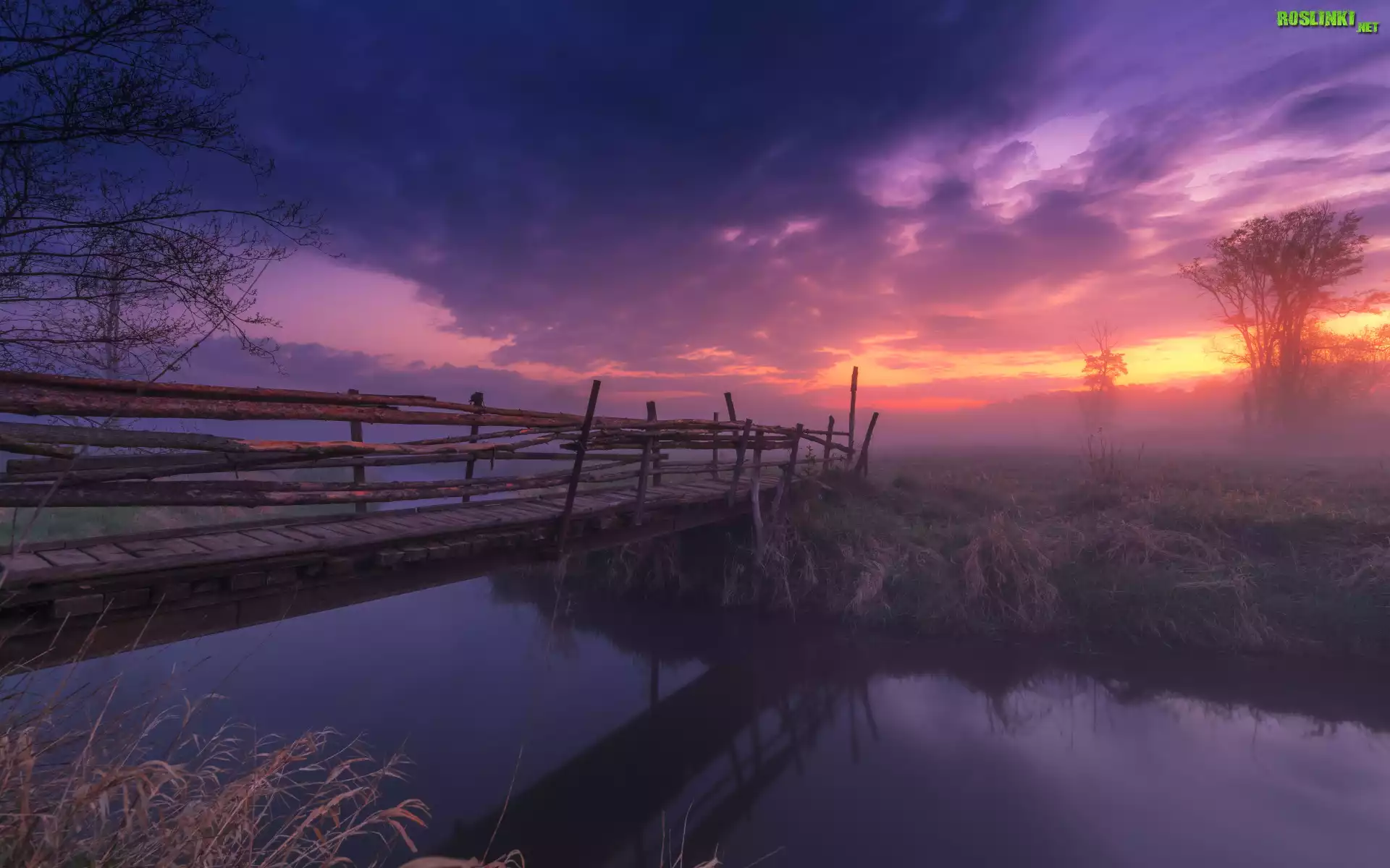 Rośliny: Jesień, Trawa, Rzeka, Most, Mgła, Drzewa, Chmury, Zachód słońca