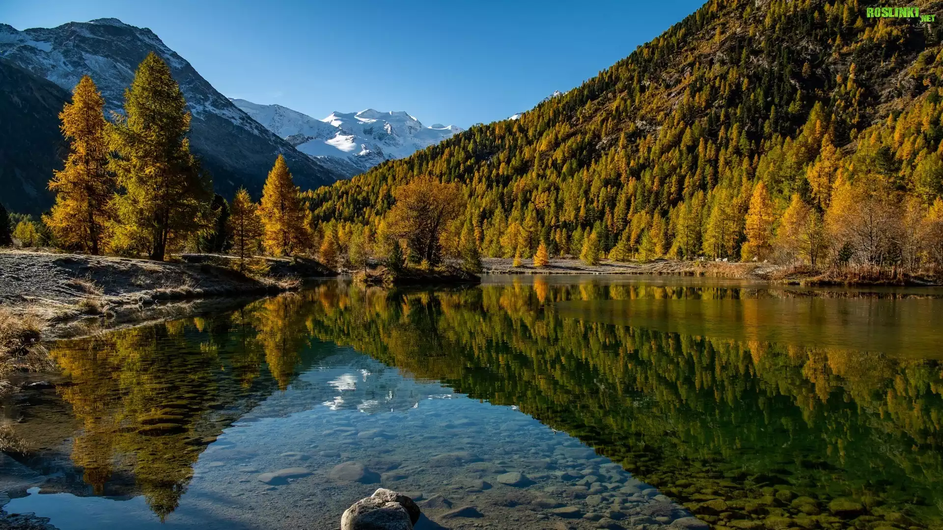 Rośliny: Jesień, Góry, Jezioro, Kolorowe, Drzewa, Odbicie, Dolina Engadyna, Szwajcaria