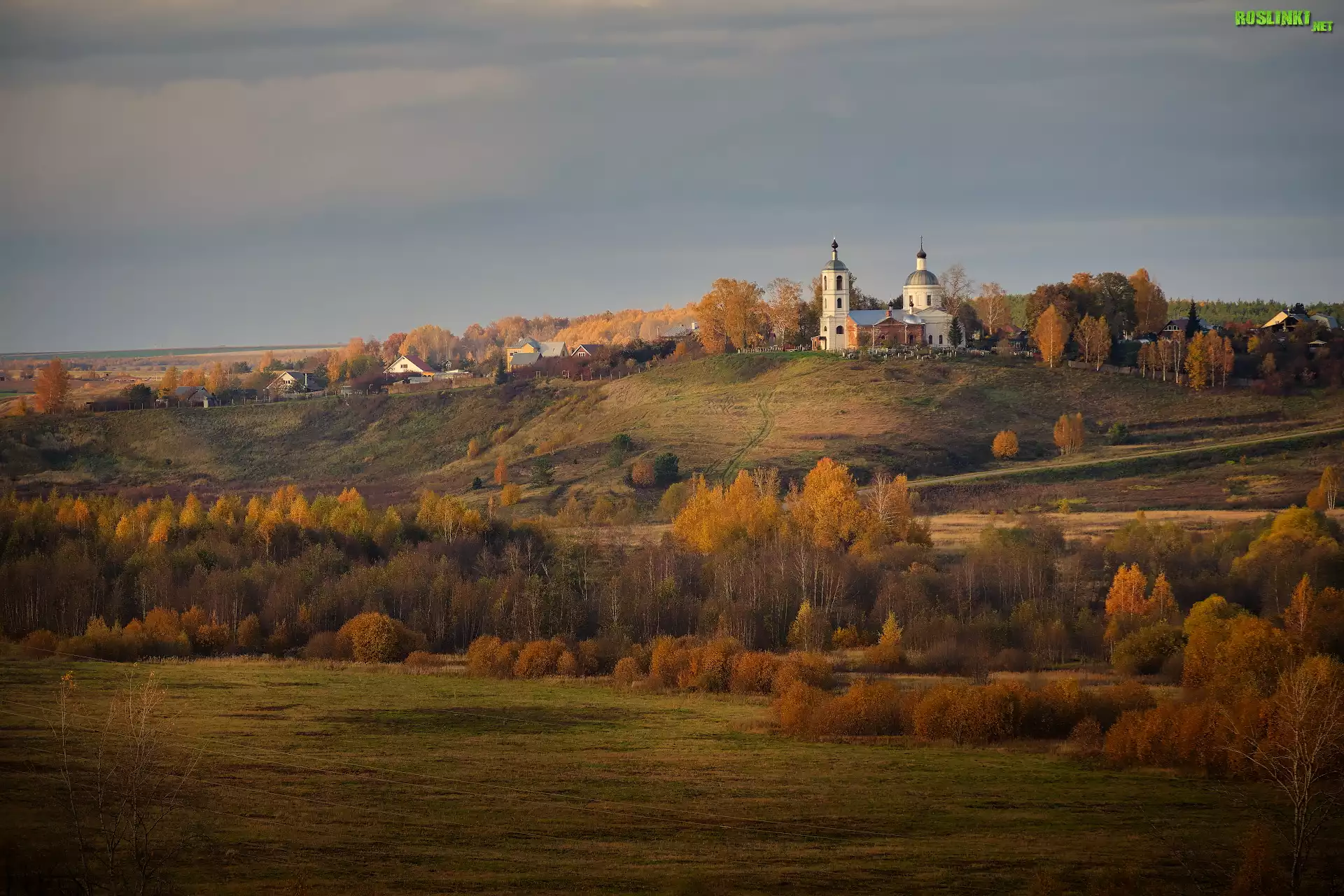 Rośliny: Jesień, Wzgórze, Drzewa, Domy, Cerkiew