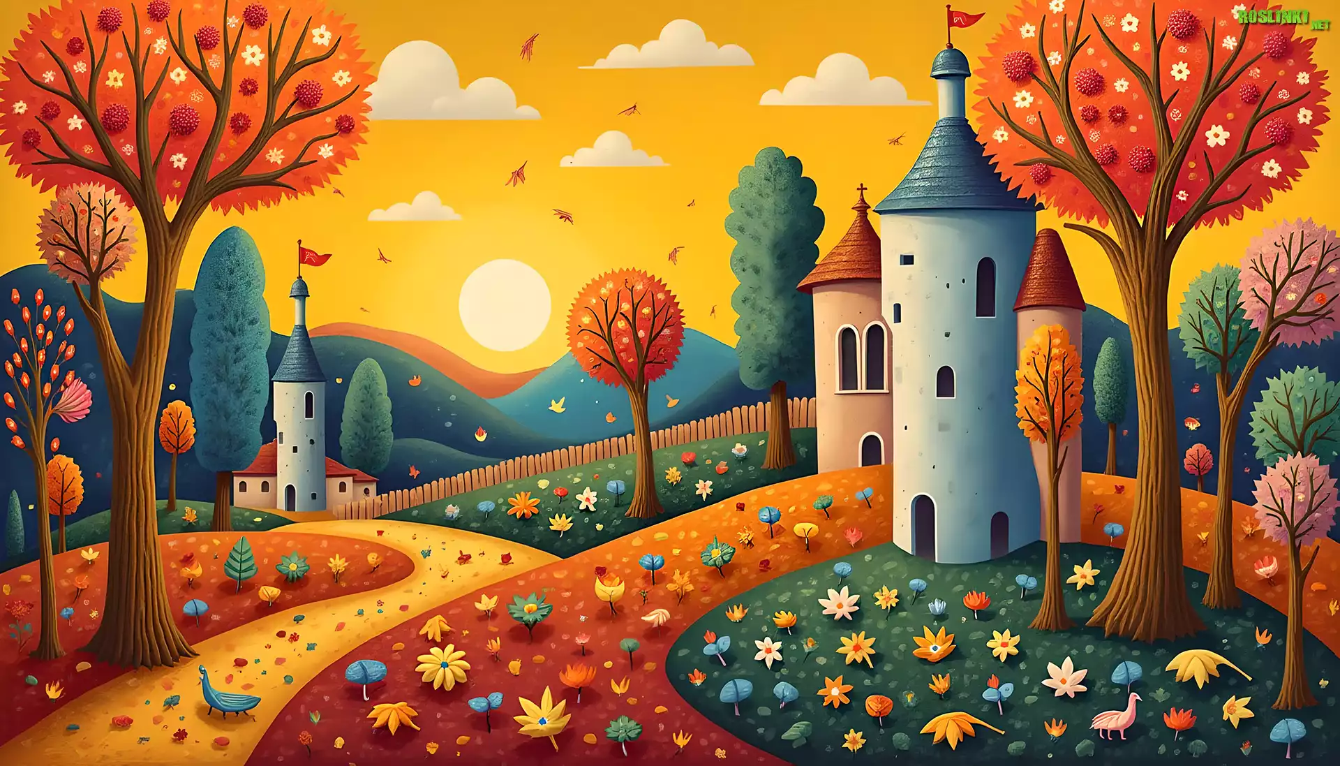 Rośliny: Kolorowa, Jesień, Domy, Drzewa, Grafika