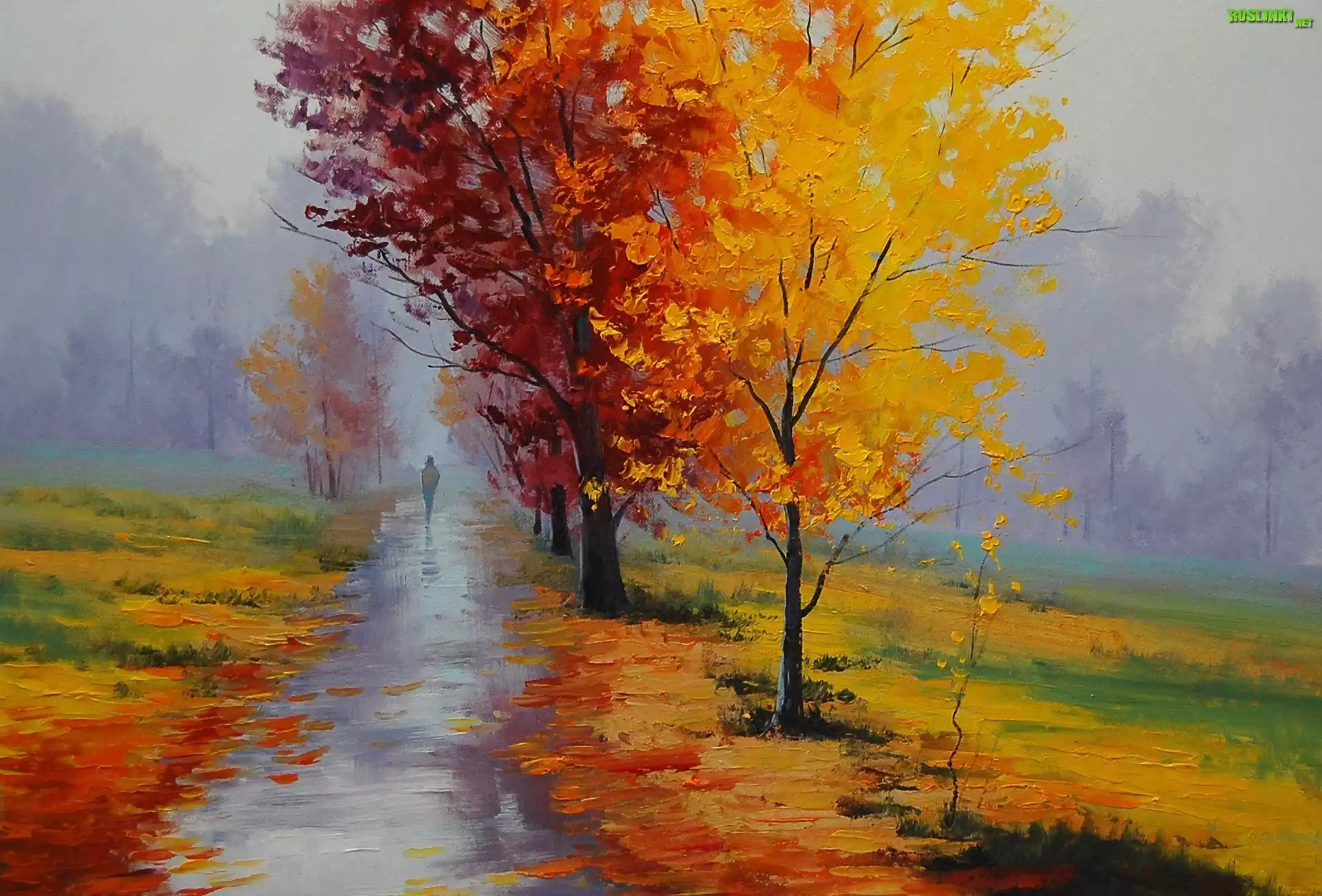 Rośliny: Jesień, Drzewa, Liście, Droga, Mgła