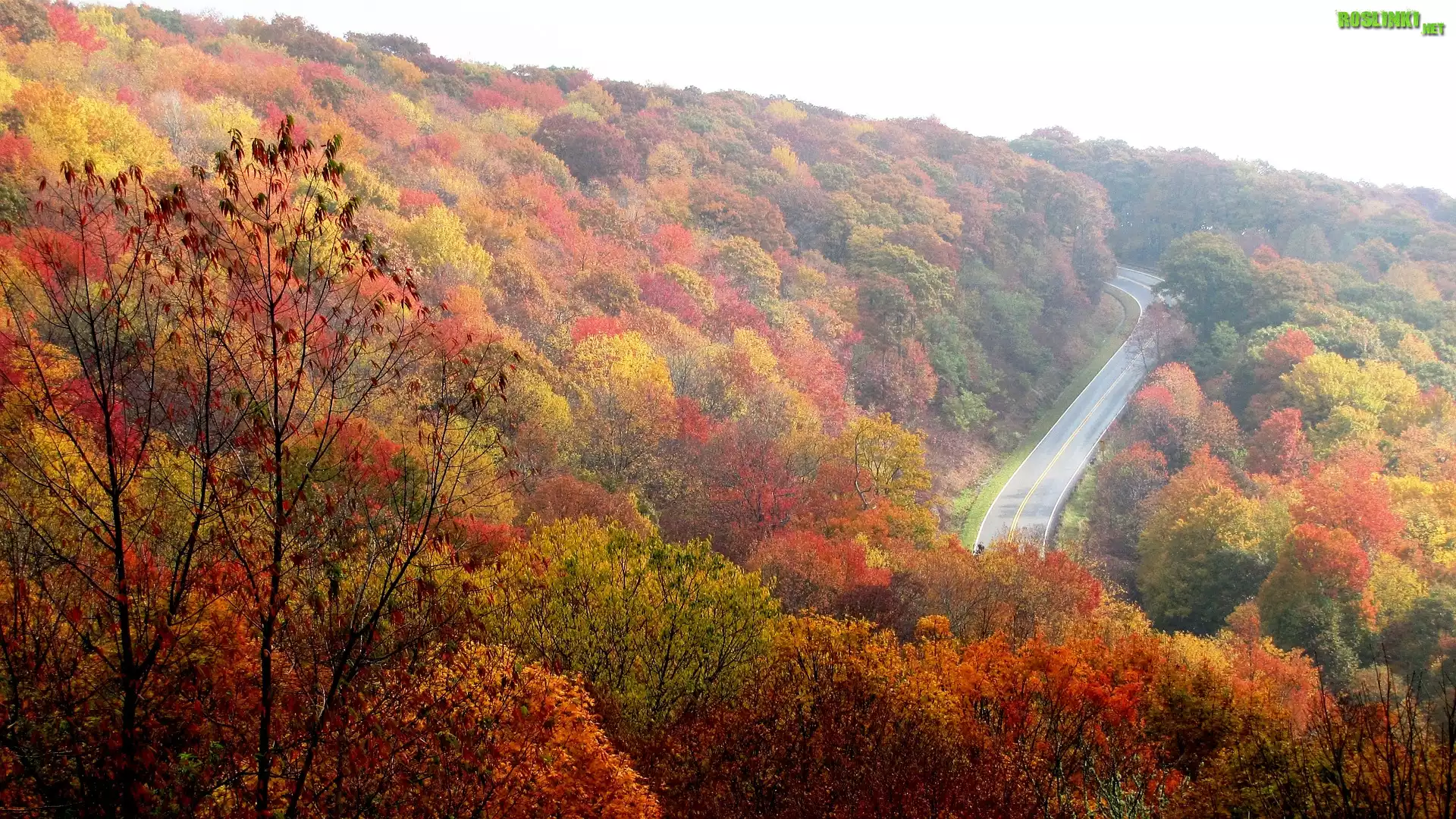 Rośliny: Jesień, Drzewa, Liście, Droga, Wzgórza