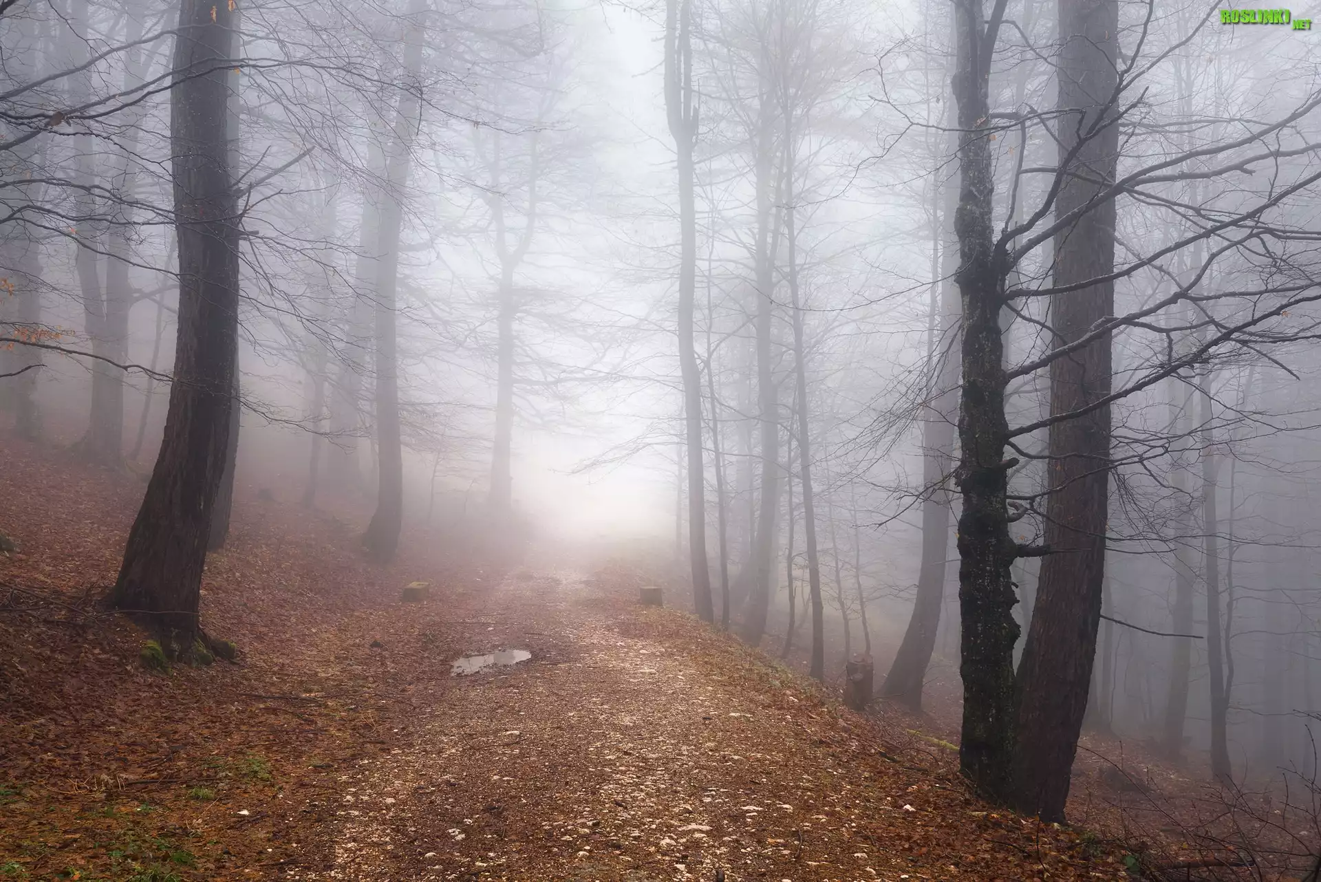 Rośliny: Jesień, Las, Bezlistne, Drzewa, Mgła