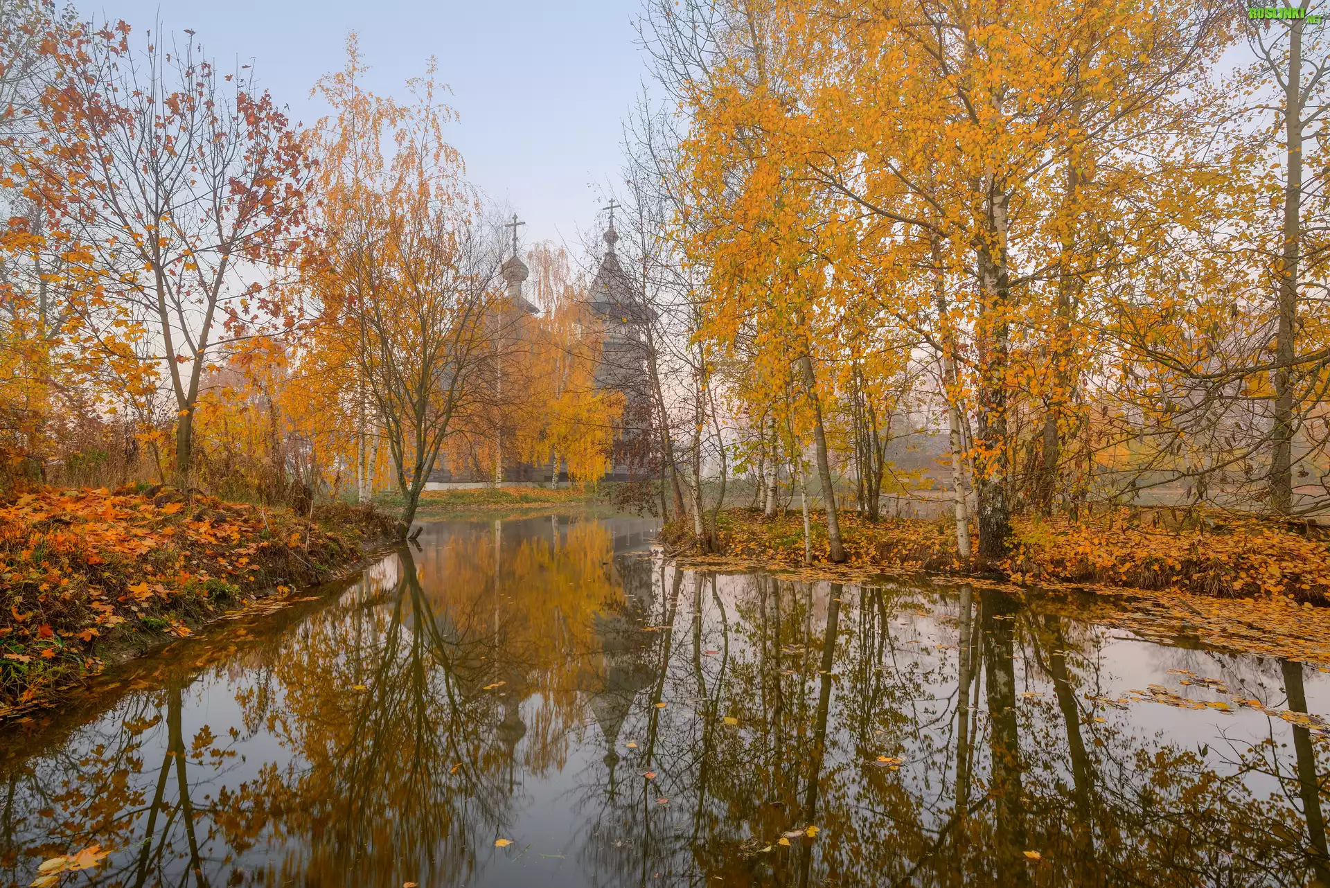 Jesień, Staw, Cerkiew, Drzewa, Brzozy