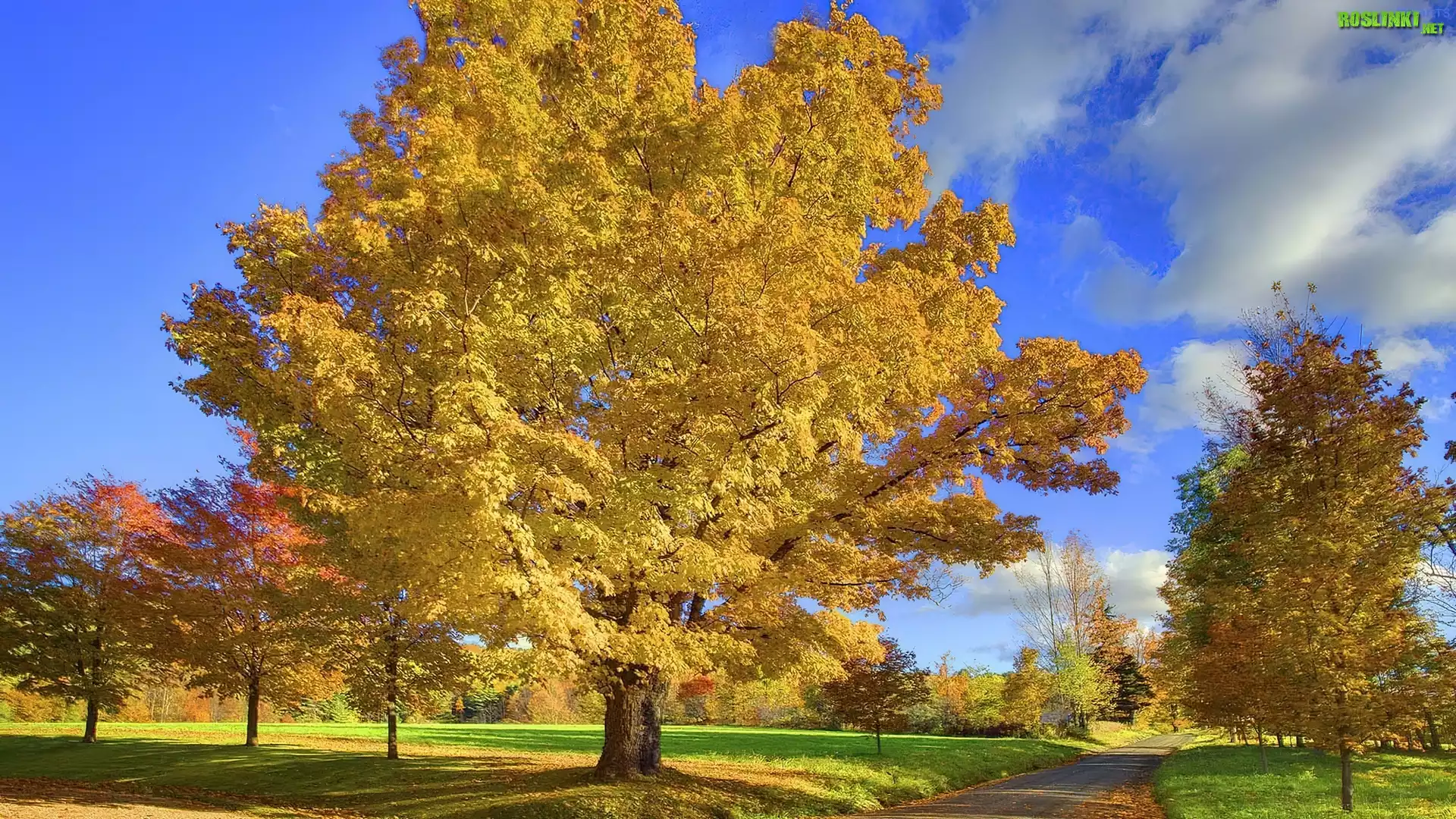 Rośliny: Jesień, Chmurki, Drzewa, Droga