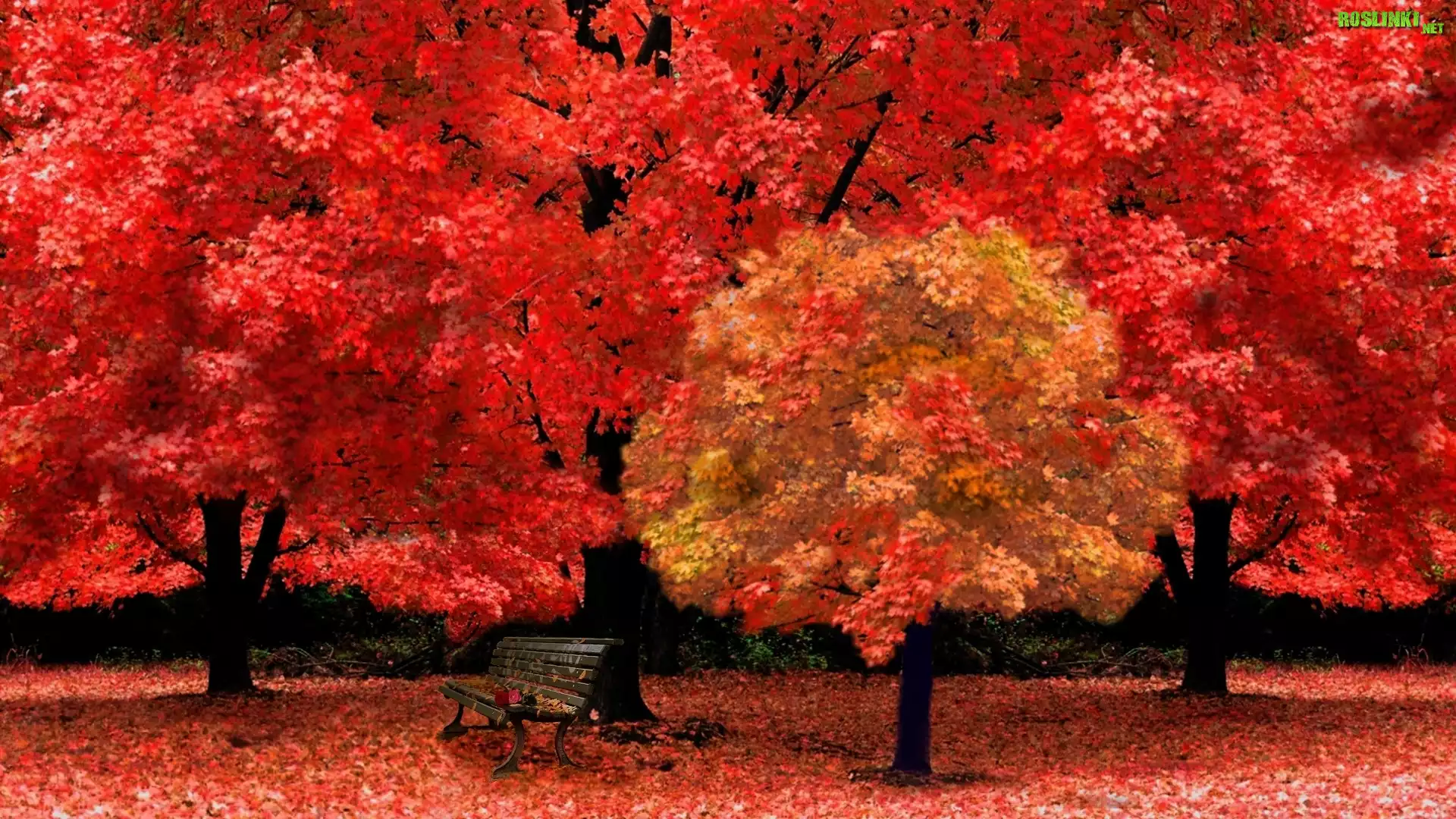 Rośliny: Jesień, Czerwone, Drzewa, Ławeczka