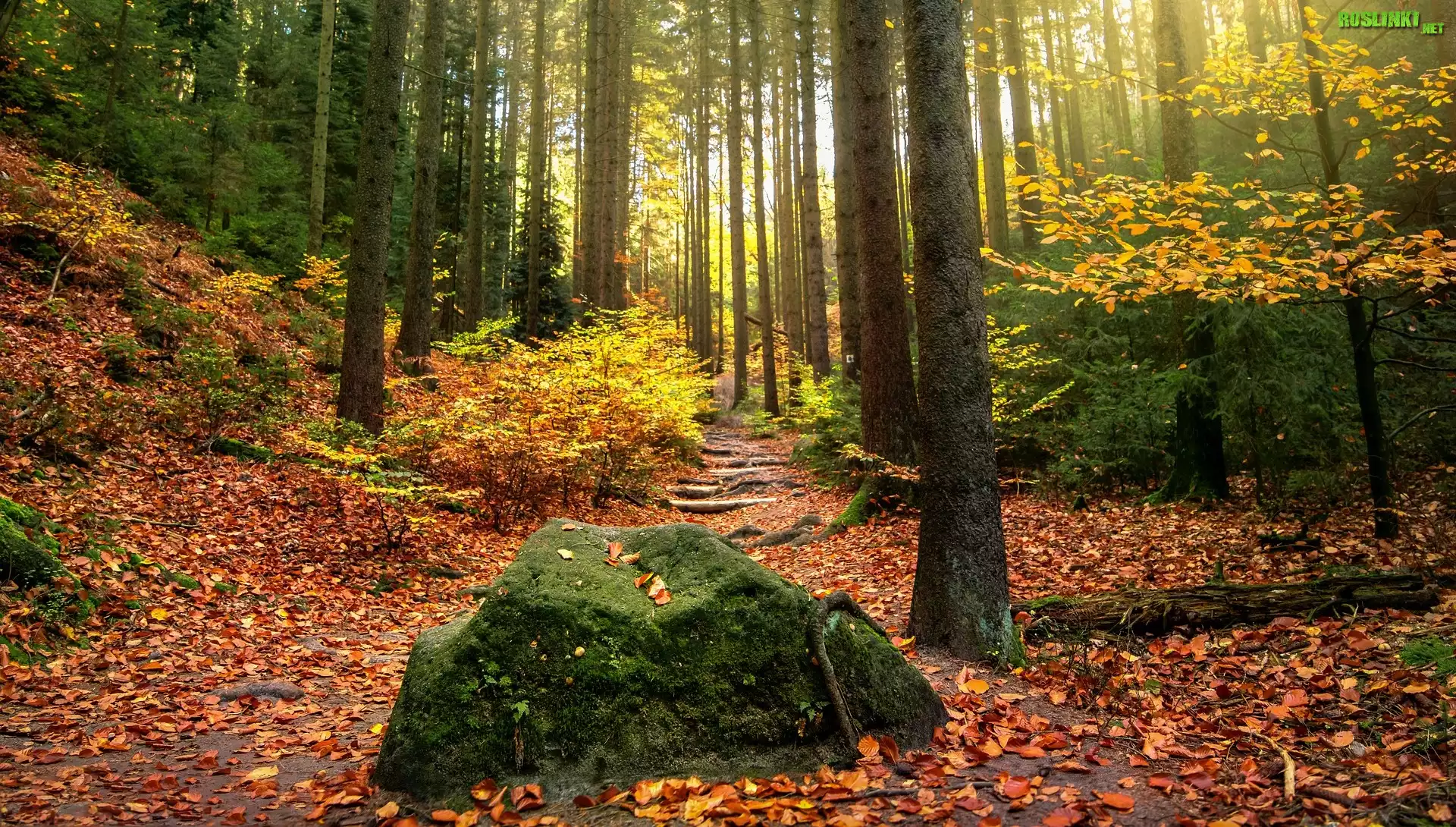 Rośliny: Jesień, Las, Droga, Kamień, Drzewa, Liście