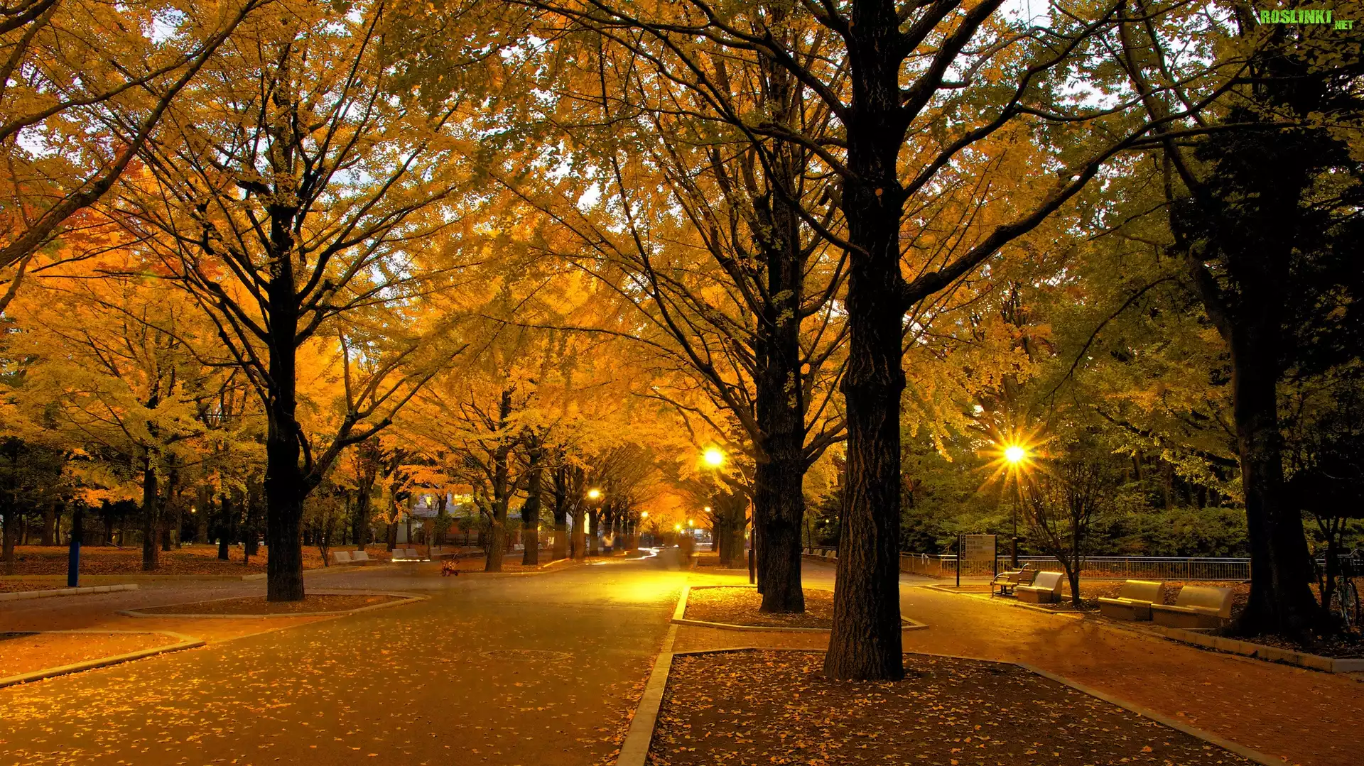 Rośliny: Jesień, Park, Droga, Drzewa, Latarnie