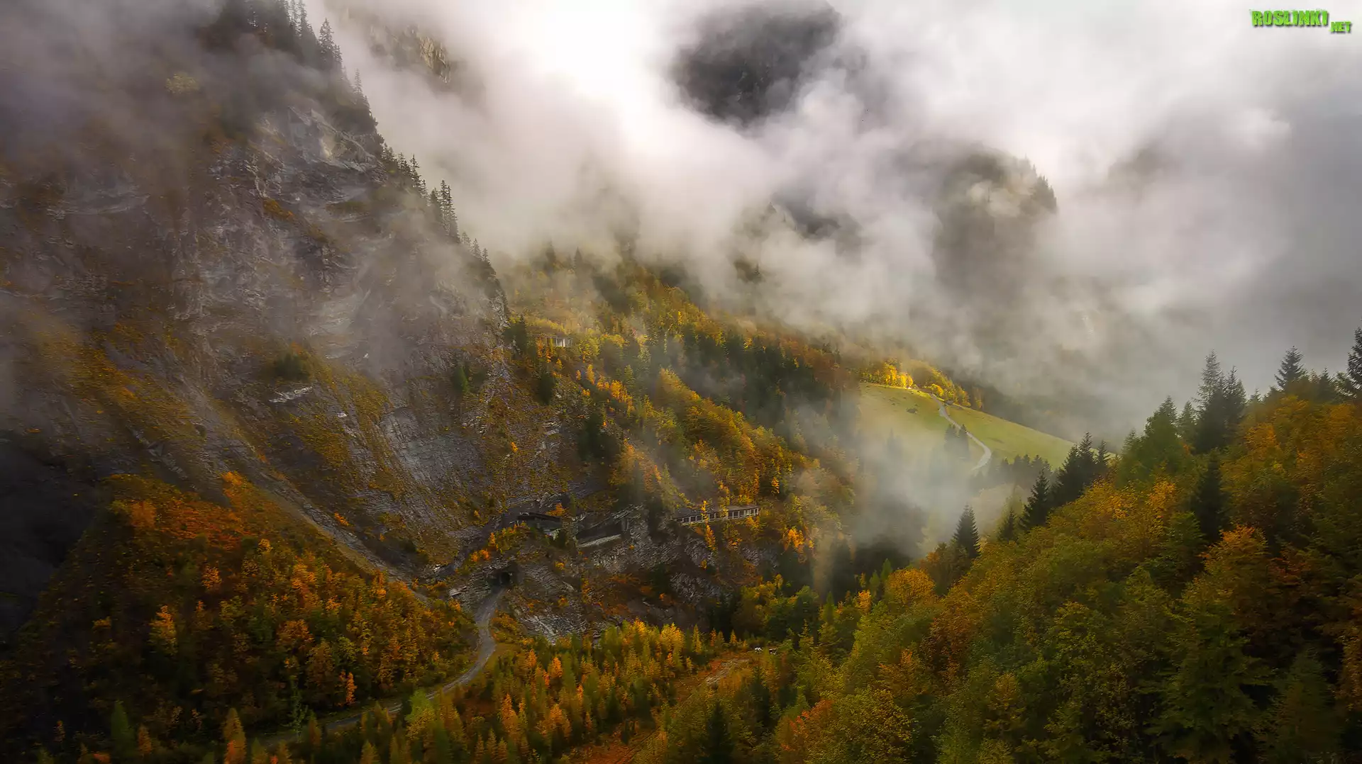 Rośliny: Jesień, Mgła, Góry, Lasy, Drzewa, Droga