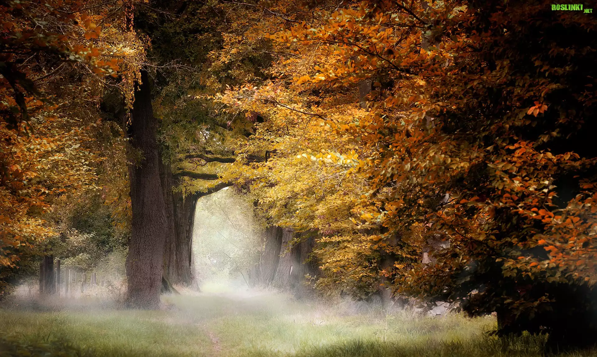 Rośliny: Jesień, Las liściasty, Drzewa, Mgła