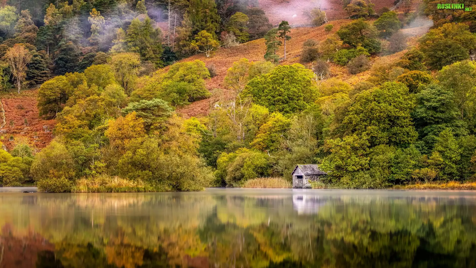 Rośliny: Jesień, Jezioro, Las, Drzewa, Odbicie, Mgła, Chata, Park Narodowy Lake District, Kumbria, Anglia