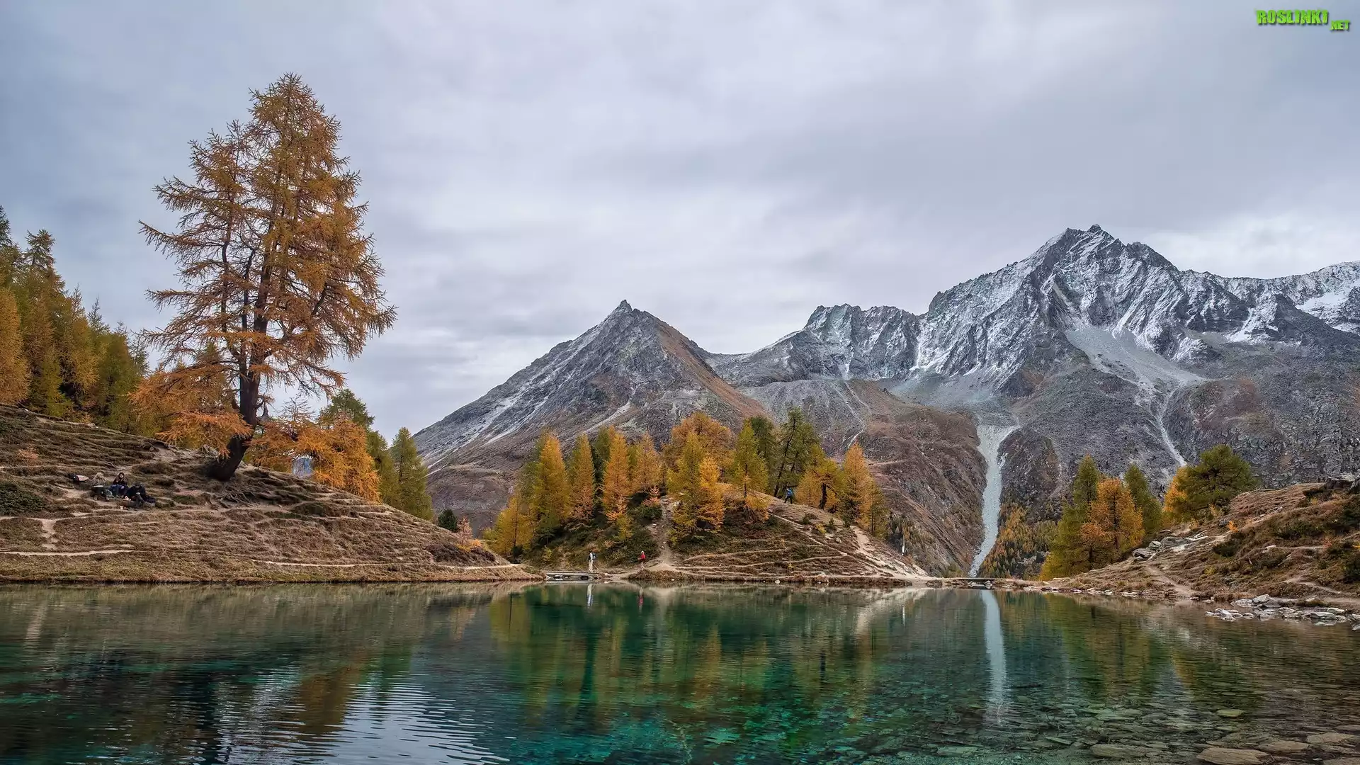 Rośliny: Jesień, Góry, Jezioro, Lac Bleu, Żółte, Drzewa, Modrzewie, Szwajcaria
